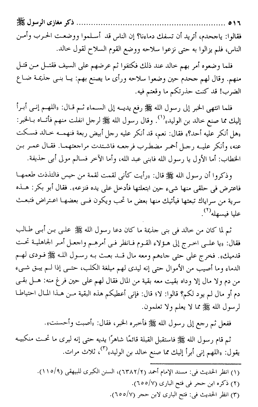 ثم قام رسول الله صلى الله عليه وسلم فاستقبل القبلة قائما شاهرا يديه حتى إنه ليرى ما تحت منكبيه يقول: «اللهم إنى أبرأ إليك مما صنع خالد بن الوليد» «3» ، ثلاث مرات.