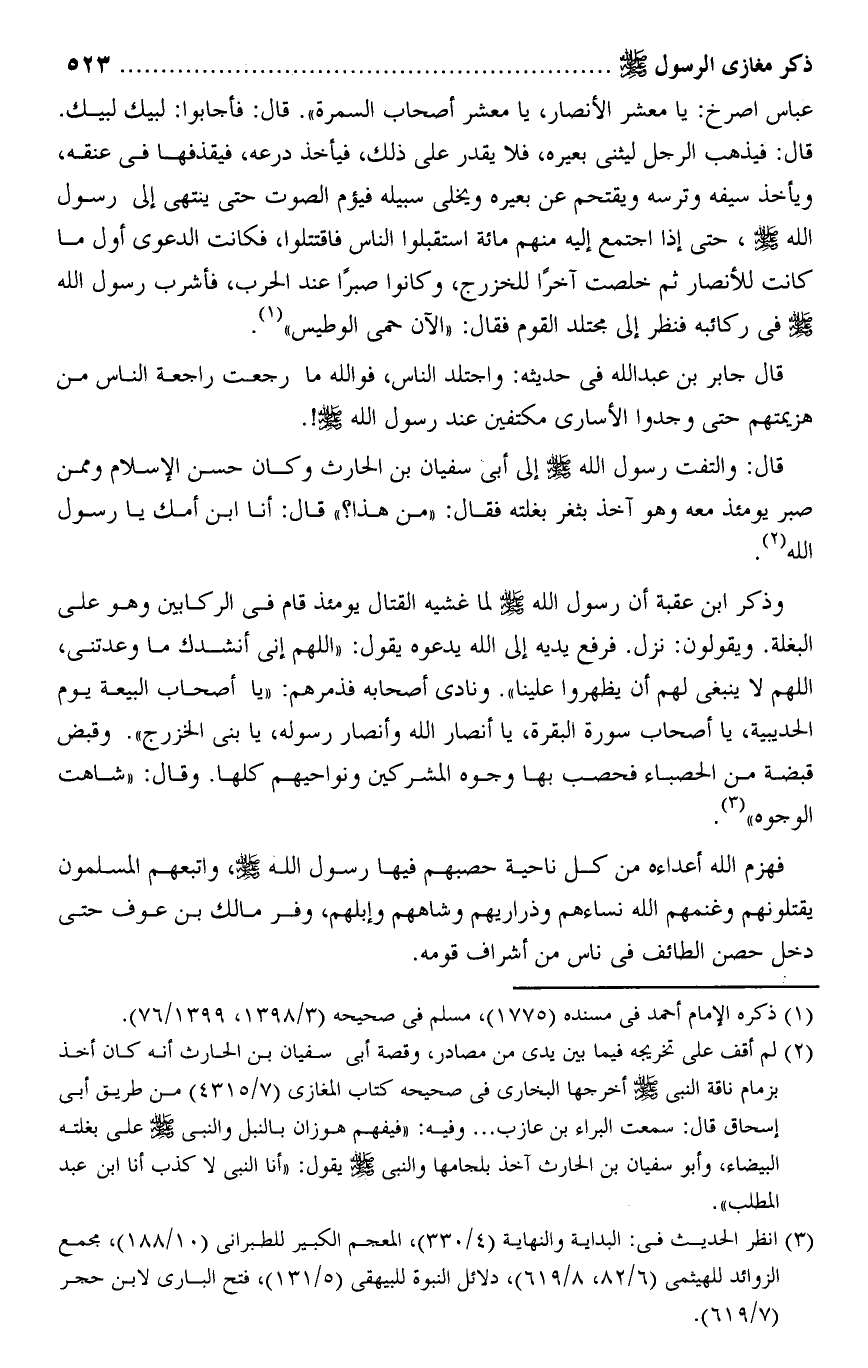 (2) لم أقف على تخريجه فيما بين يدى من مصادر، وقصة أبى سفيان بن الحارث أنه كان أخذ بزمام ناقة النبى صلى الله عليه وسلم أخرجها البخارى فى صحيحه كتاب المغازى (7/ 4315) من طريق أبى إسحاق قال: سمعت البراء بن عازب ... وفيه: «فيفهم هوزان بالنبل والنبى صلى الله عليه وسلم على بغلته البيضاء، وأبو سفيان بن الحارث آخذ بلجامها والنبى صلى الله عليه وسلم يقول: «أنا النبى لا كذب أنا ابن عبد المطلب» .