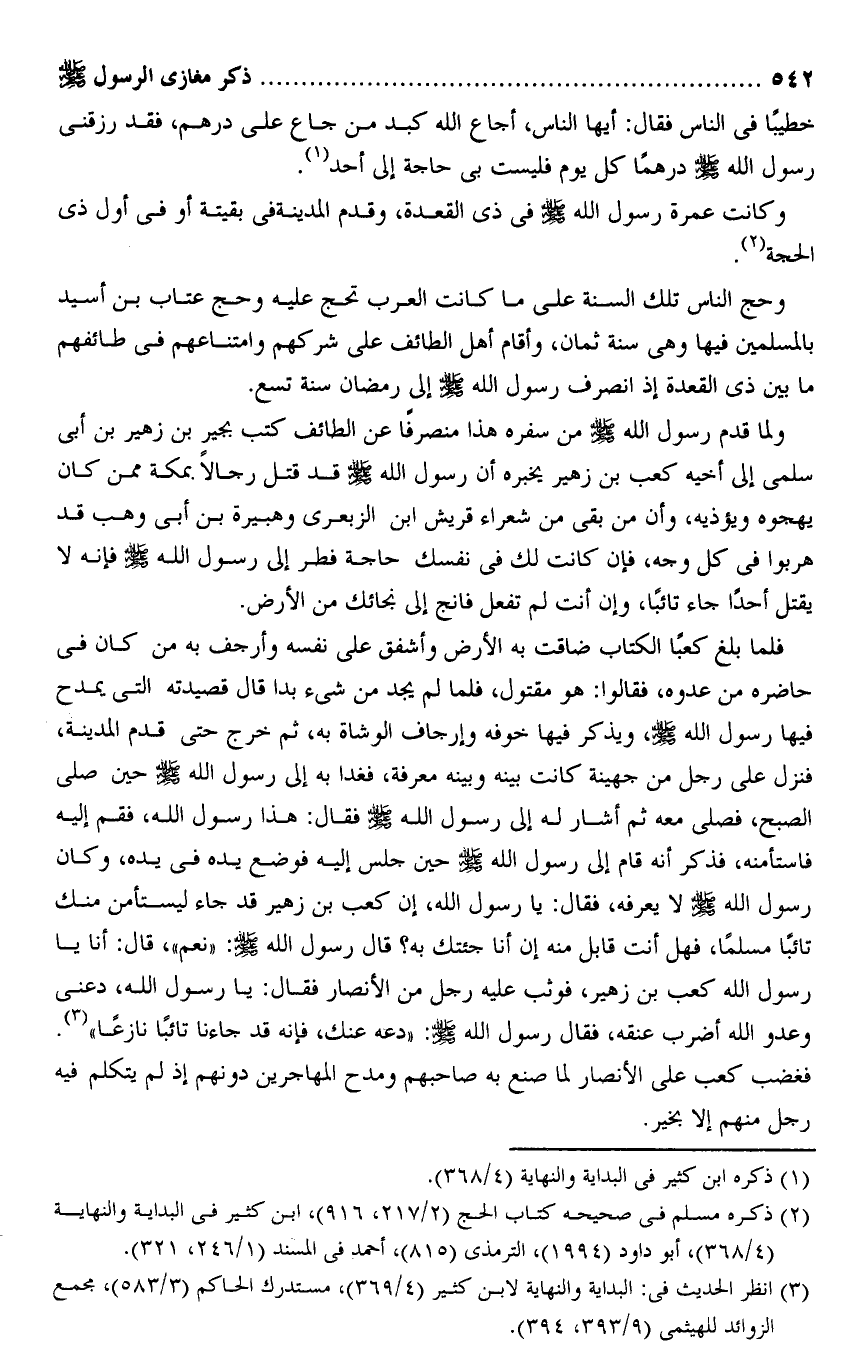 ولما قدم رسول الله صلى الله عليه وسلم من سفره هذا منصرفا عن الطائف كتب بجير بن زهير بن أبى سلمى إلى أخيه كعب بن زهير يخبره أن رسول الله صلى الله عليه وسلم قد قتل رجالا بمكة ممن كان يهجوه ويؤذيه، وأن من بقى من شعراء قريش ابن الزبعرى وهبيرة بن أبى وهب قد هربوا فى كل وجه، فإن كانت لك فى نفسك حاجة فطر إلى رسول الله صلى الله عليه وسلم فإنه لا يقتل أحدا جاء تائبا، وإن أنت لم تفعل فانج إلى نجائك من الأرض.