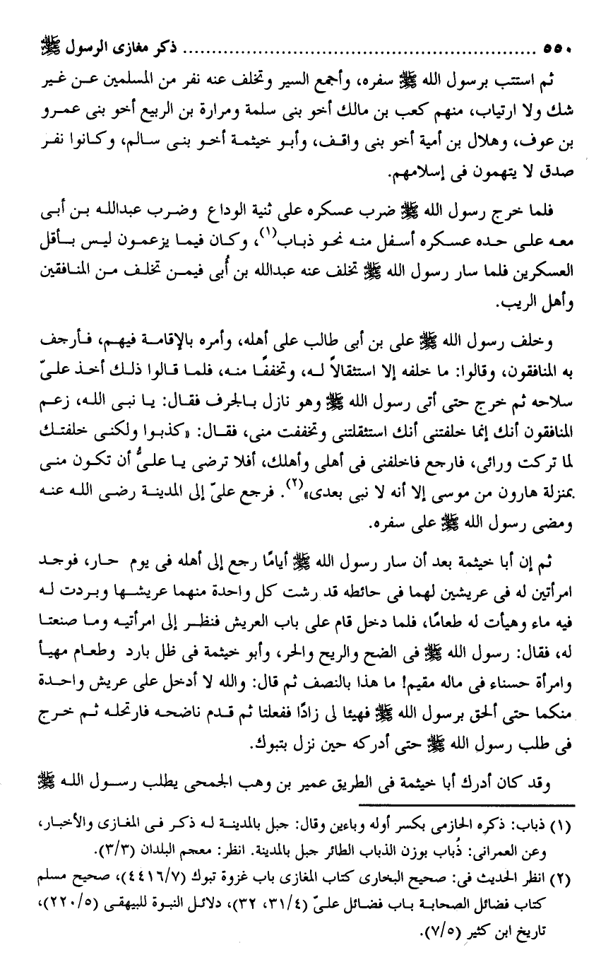 ثم استتب برسول الله صلى الله عليه وسلم سفره، وأجمع السير وتخلف عنه نفر من المسلمين عن غير شك ولا ارتياب، منهم كعب بن مالك أخو بنى سلمة ومرارة بن الربيع أخو بنى عمرو بن عوف، وهلال بن أمية أخو بنى واقف، وأبو خيثمة أخو بنى سالم، وكانوا نفر صدق لا يتهمون فى إسلامهم.