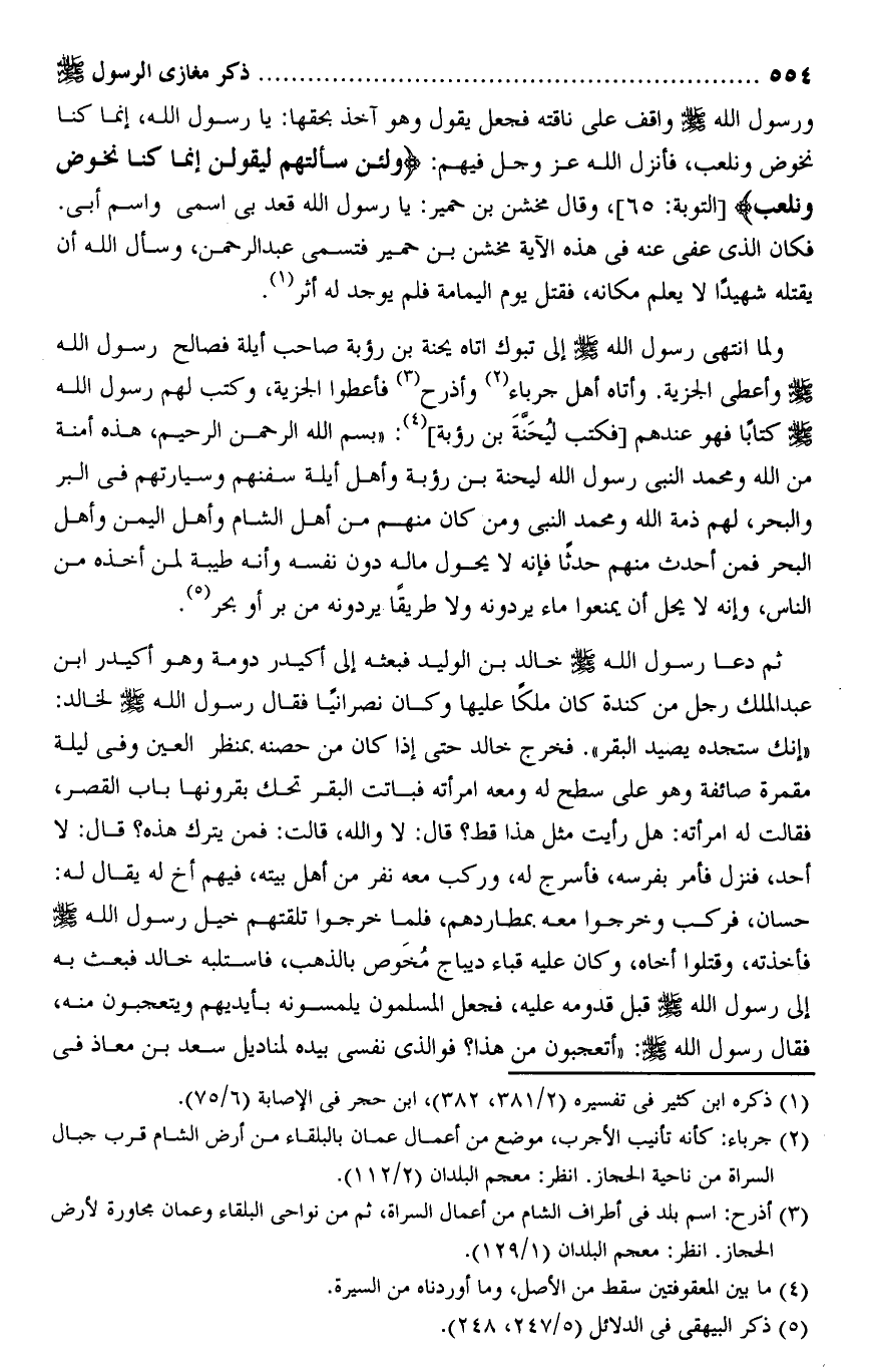 ولما انتهى رسول الله صلى الله عليه وسلم إلى تبوك اتاه يحنة بن رؤبة صاحب أيلة فصالح رسول الله صلى الله عليه وسلم وأعطى الجزية. وأتاه أهل جرباء «2» وأذرح «3» فأعطوا الجزية، وكتب لهم رسول الله صلى الله عليه وسلم كتابا فهو عندهم [فكتب ليحنّة بن رؤبة] «4» : «بسم الله الرحمن الرحيم، هذه أمنة من الله ومحمد النبى رسول الله ليحنة بن رؤبة وأهل أيلة سفنهم وسيارتهم فى البر والبحر، لهم ذمة الله ومحمد النبى ومن كان منهم من أهل الشام وأهل اليمن وأهل البحر فمن أحدث منهم حدثا فإنه لا يحول ماله دون نفسه وأنه طيبة لمن أخذه من الناس، وإنه لا يحل أن يمنعوا ماء يردونه ولا طريقا يردونه من بر أو بحر «5» .