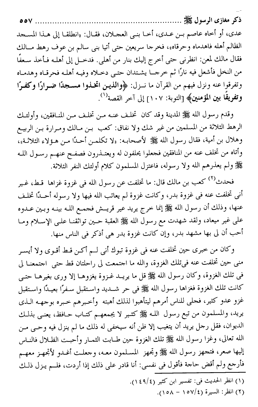 فحدث «2» كعب بن مالك قال: ما تخلفت عن رسول الله فى غزوة غزاها قط، غير أنى تخلفت عنه فى غزوة بدر، وكانت غزوة لم يعاتب الله فيها ولا رسوله أحدا تخلف عنها، وذلك أن رسول الله صلى الله عليه وسلم إنما خرج يريد عير قريش فجمع الله بينه وبين عدوه على غير ميعاد، ولقد شهدت مع رسول الله صلى الله عليه وسلم العقبة حين تواثقنا على الإسلام وما أحب أن لى بها مشهد بدر، وإن كانت غزوة بدر هى أذكر فى الناس منها.