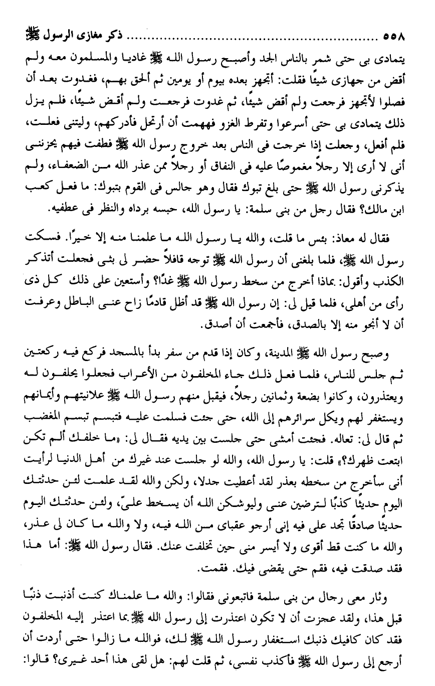 وصبح رسول الله صلى الله عليه وسلم المدينة، وكان إذا قدم من سفر بدأ بالمسجد فركع فيه ركعتين ثم جلس للناس، فلما فعل ذلك جاء المخلفون من الأعراب فجعلوا يحلفون له ويعتذرون، وكانوا بضعة وثمانين رجلا، فيقبل منهم رسول الله صلى الله عليه وسلم علانيتهم وأيمانهم ويستغفر لهم ويكل سرائرهم إلى الله، حتى جئت فسلمت عليه فتبسم تبسم المغضب ثم قال لى: تعاله. فجئت أمشى حتى جلست بين يديه فقال لى: «ما خلفك ألم تكن ابتعت ظهرك؟» قلت: يا رسول الله، والله لو جلست عند غيرك من أهل الدنيا لرأيت أنى سأخرج من سخطه بعذر لقد أعطيت جدلا، ولكن والله لقد علمت لئن حدثتك اليوم حديثا كذبا لترضين عنى وليوشكن الله أن يسخط علىّ، ولئن حدثتك اليوم حديثا صادقا تجد على فيه إنى أرجو عقباى من الله فيه، ولا والله ما كان لى عذر، والله ما كنت قط أقوى ولا أيسر منى حين تخلفت عنك. فقال رسول الله صلى الله عليه وسلم: أما هذا فقد صدقت فيه، فقم حتى يقضى فيك. فقمت.