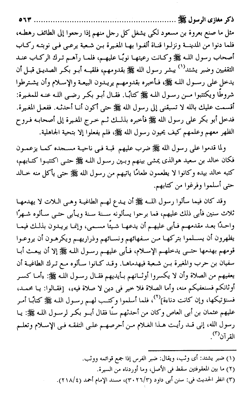 مثل ما صنع بعروة بن مسعود لكى يشغل كل رجل منهم إذا رجعوا إلى الطائف رهطه، فلما دنوا من المدينة ونزلوا قناة ألفوا بها المغيرة بن شعبة يرعى فى نوبته ركاب أصحاب رسول الله صلى الله عليه وسلم وكانت رعيتها نوبا عليهم، فلما رآهم ترك الركاب عند الثقفيين وضبر يشتد «1» يبشر رسول الله صلى الله عليه وسلم بقدومهم، فلقيه أبو بكر الصديق قبل أن يدخل على رسول الله صلى الله عليه وسلم، فأخبره بقدومهم يريدون البيعة والإسلام وأن يشترطوا شروطا ويكتتبوا من رسول الله صلى الله عليه وسلم كتابا. فقال أبو بكر رضى الله عنه للمغيرة: