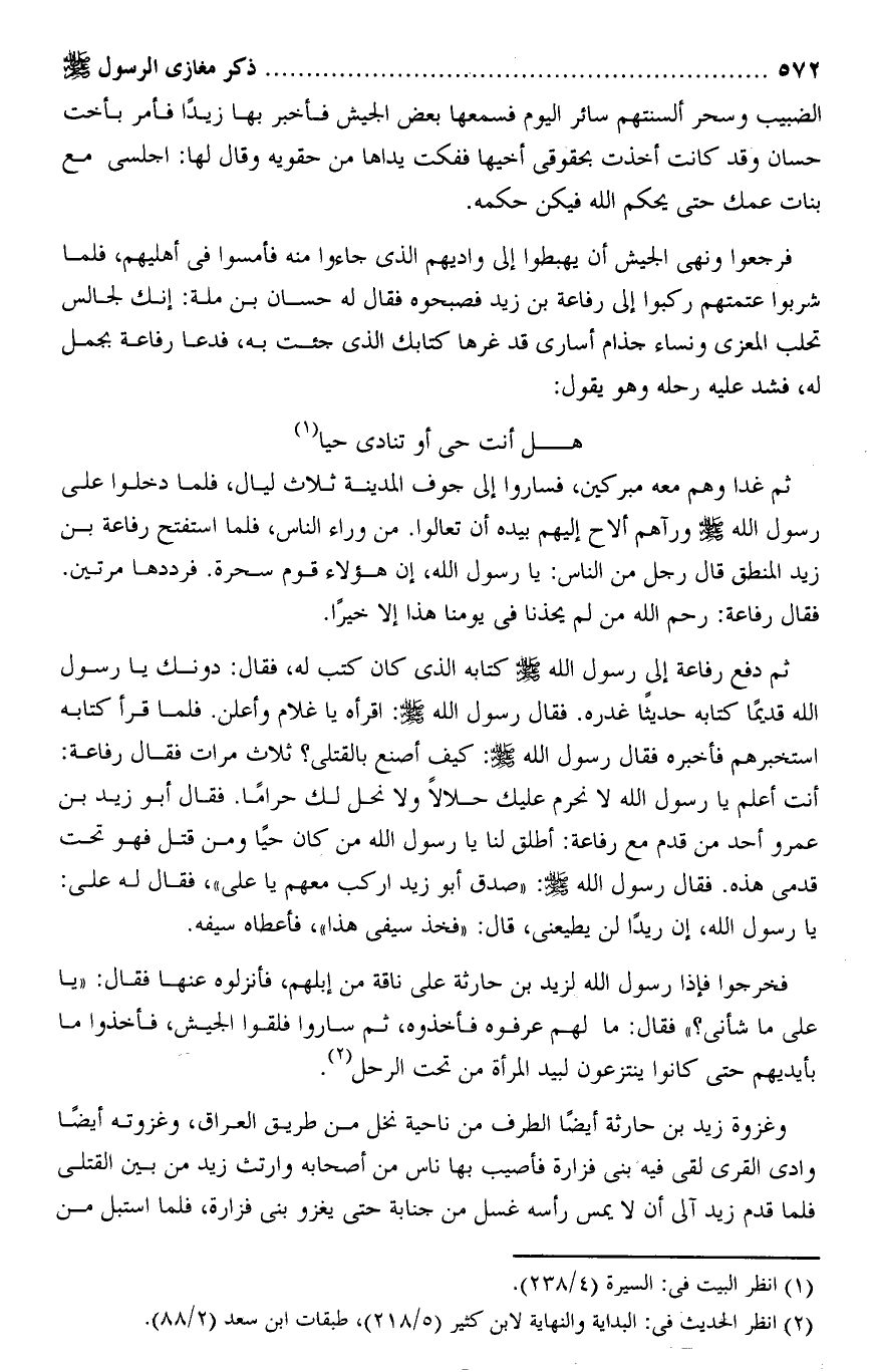 فخرجوا فإذا رسول الله لزيد بن حارثة على ناقة من إبلهم، فأنزلوه عنها فقال: «يا على ما شأنى؟» فقال: ما لهم عرفوه فأخذوه، ثم ساروا فلقوا الجيش، فأخذوا ما بأيديهم حتى كانوا ينتزعون لبيد المرأة من تحت الرحل «2» .