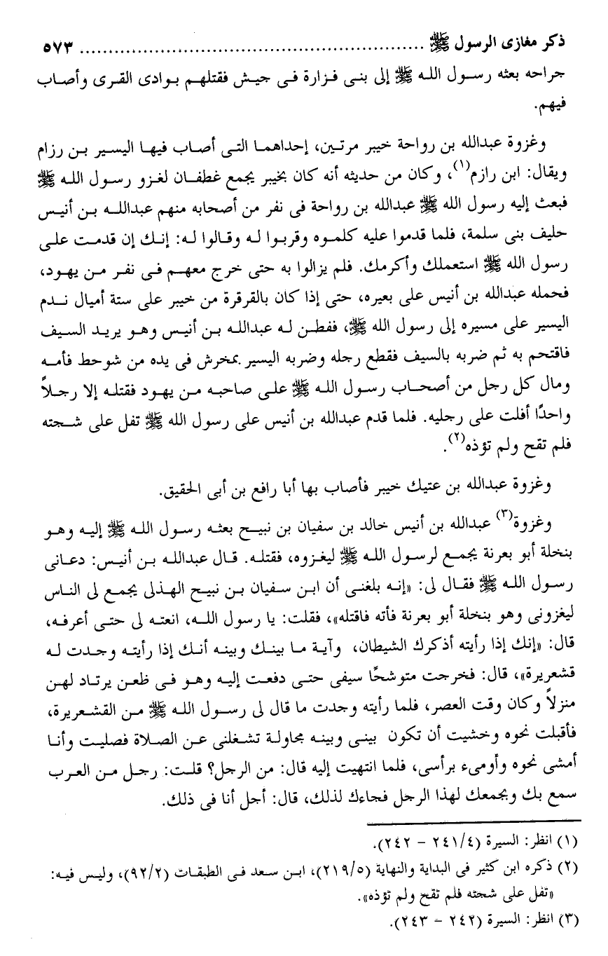 وغزوة «3» عبد الله بن أنيس خالد بن سفيان بن نبيح بعثه رسول الله صلى الله عليه وسلم إليه وهو بنخلة أبو بعرنة يجمع لرسول الله صلى الله عليه وسلم ليغزوه، فقتله. قال عبد الله بن أنيس: دعانى رسول الله صلى الله عليه وسلم فقال لى: «إنه بلغنى أن ابن سفيان بن نبيح الهذلى يجمع لى الناس ليغزونى وهو بنخلة أبو بعرنة فأته فاقتله» ، فقلت: يا رسول الله، انعته لى حتى أعرفه، قال: «إنك إذا رأيته أذكرك الشيطان، وآية ما بينك وبينه أنك إذا رأيته وجدت له قشعريرة» ، قال: فخرجت متوشحا سيفى حتى دفعت إليه وهو فى ظعن يرتاد لهن منزلا وكان وقت العصر، فلما رأيته وجدت ما قال لى رسول الله صلى الله عليه وسلم من القشعريرة، فأقبلت نحوه وخشيت أن تكون بينى وبينه مجاولة تشغلنى عن الصلاة فصليت وأنا أمشى نحوه وأومىء برأسى، فلما انتهيت إليه قال: من الرجل؟ قلت: رجل من العرب سمع بك وبجمعك لهذا الرجل فجاءك لذلك، قال: أجل أنا فى ذلك.