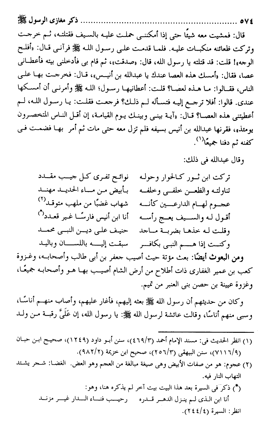 قال: فمشيت معه شيئا حتى إذا أمكننى حملت عليه بالسيف فقتلته، ثم خرجت وتركت ظعائنه منكبات عليه. فلما قدمت على رسول الله صلى الله عليه وسلم فرآنى قال: «أفلح الوجه» ! قلت: قد قتلته يا رسول الله، قال: «صدقت» ، ثم قام بى فأدخلنى بيته فأعطانى عصا، فقال: «أمسك هذه العصا عندك يا عبد الله بن أنيس» ، قال: فخرجت بها على الناس، فقالوا: ما هذه لعصا؟ قلت: أعطانيها رسول؛ الله صلى الله عليه وسلم وأمرنى أن أمسكها عندى. قالوا: أفلا ترجع إليه فتسأله لم ذلك؟ فرجعت فقلت: يا رسول الله، لم أعطيتنى هذه العصا؟ قال: «آية بينى وبينك يوم القيامة، إن أقل الناس المتخصرون يومئذ» ، فقرنها عبد الله بن أنيس بسيفه فلم تزل معه حتى مات ثم أمر بها فضمت فى كفنه ثم دفنا جميعا «1» .