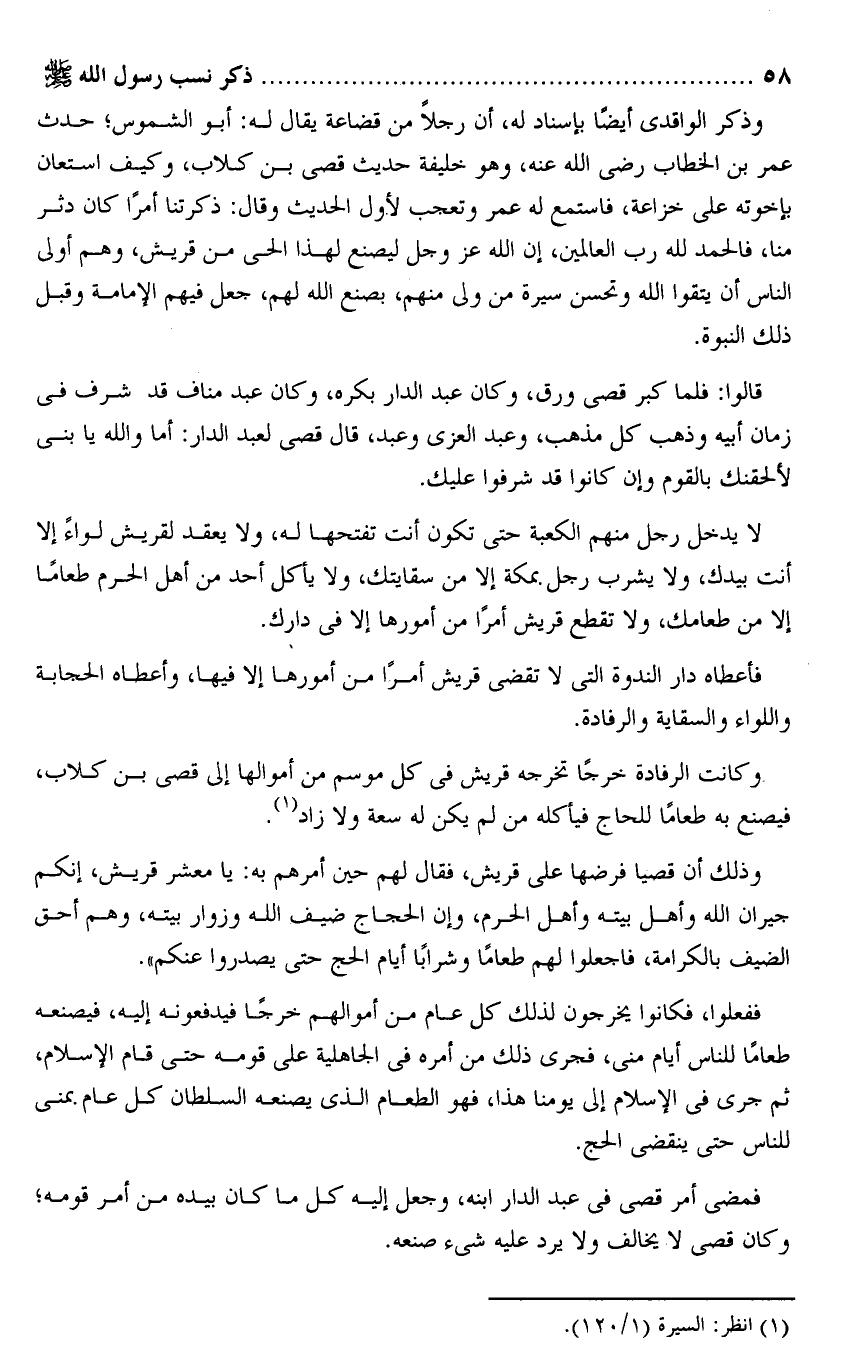 وذكر الواقدى أيضا بإسناد له، أن رجلا من قضاعة يقال له: أبو الشموس؛ حدث عمر بن الخطاب رضى الله عنه، وهو خليفة حديث قصى بن كلاب، وكيف استعان بإخوته على خزاعة، فاستمع له عمر وتعجب لأول الحديث وقال: ذكرتنا أمرا كان دثر منا، فالحمد لله رب العالمين، إن الله عز وجل ليصنع لهذا الحى من قريش، وهم أولى الناس أن يتقوا الله وتحسن سيرة من ولى منهم، بصنع الله لهم، جعل فيهم الإمامة وقبل ذلك النبوة.