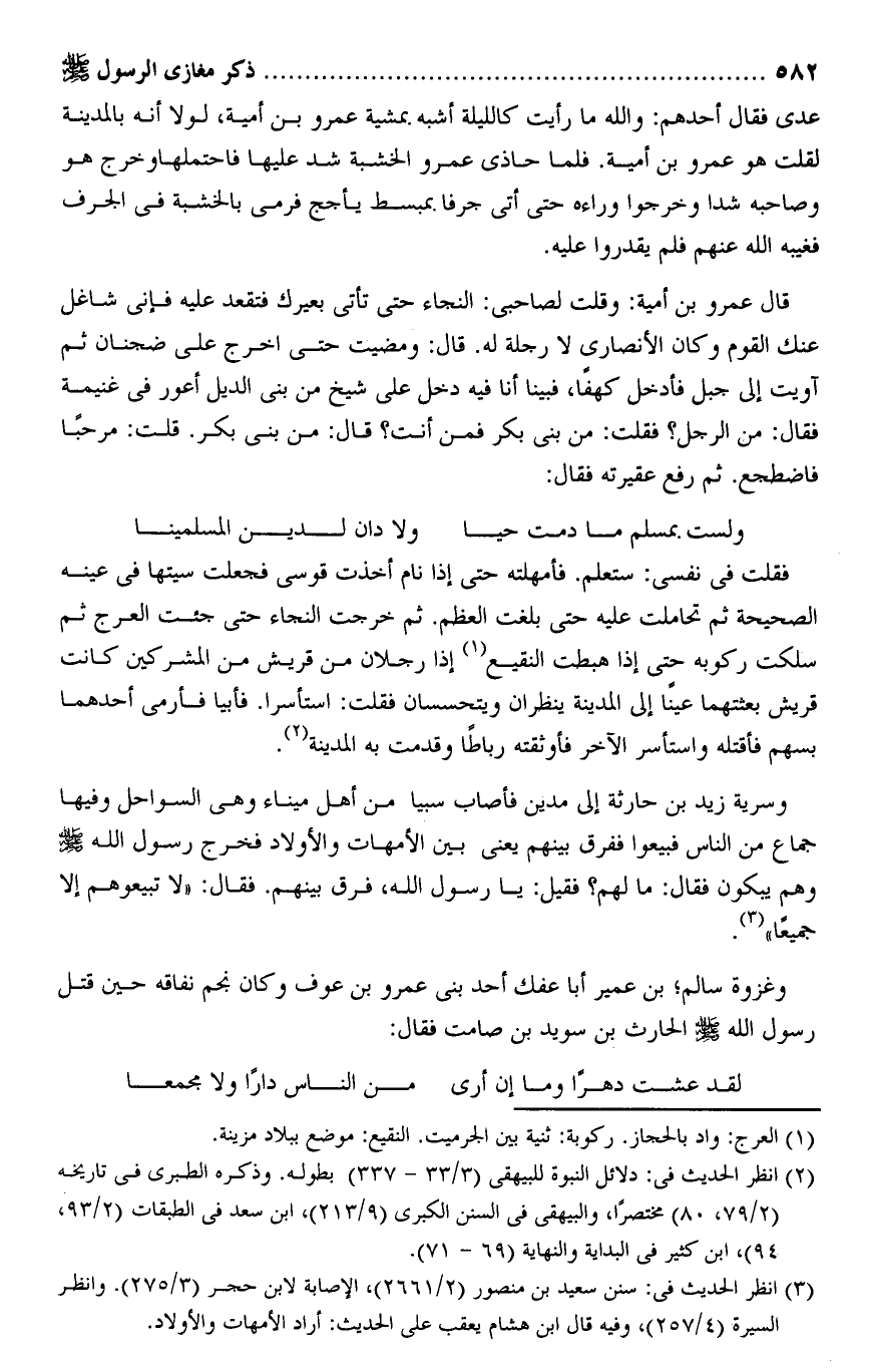 عدى فقال أحدهم: والله ما رأيت كالليلة أشبه بمشية عمرو بن أمية، لولا أنه بالمدينة لقلت هو عمرو بن أمية. فلما حاذى عمرو الخشبة شد عليها فاحتملها وخرج هو وصاحبه شدا وخرجوا وراءه حتى أتى جرفا بمبسط يأجج فرمى بالخشبة فى الجرف فغيبه الله عنهم فلم يقدروا عليه.