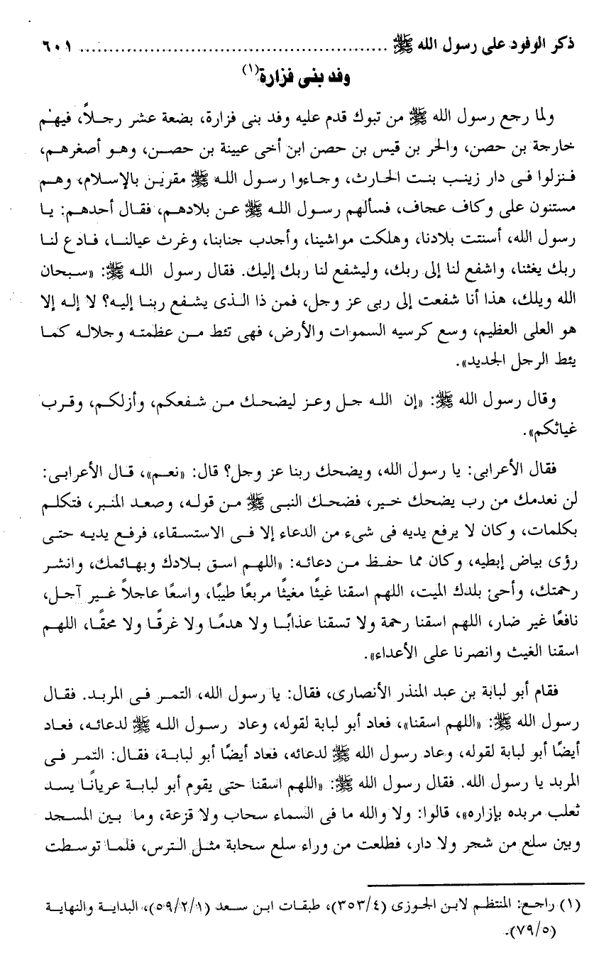 ولما رجع رسول الله صلى الله عليه وسلم من تبوك قدم عليه وفد بنى فزارة، بضعة عشر رجلا، فيهم خارجة بن حصن، والحر بن قيس بن حصن ابن أخى عيينة بن حصن، وهو أصغرهم، فنزلوا فى دار زينب بنت الحارث، وجاؤا رسول الله صلى الله عليه وسلم مقرين بالإسلام، وهم مستنون على وكاف عجاف، فسألهم رسول الله صلى الله عليه وسلم عن بلادهم، فقال أحدهم: يا رسول الله، أسنتت بلادنا، وهلكت مواشينا، وأجدب جنابنا، وغرث عيالنا، فادع لنا ربك يغثنا، واشفع لنا إلى ربك، وليشفع لنا ربك إليك. فقال رسول الله صلى الله عليه وسلم: «سبحان الله ويلك، هذا أنا شفعت إلى ربى عز وجل، فمن ذا الذى يشفع ربنا إليه؟ لا إله إلا هو العلى العظيم، وسع كرسيه السموات والأرض، فهى تئط من عظمته وجلاله كما يئط الرجل الجديد» .
