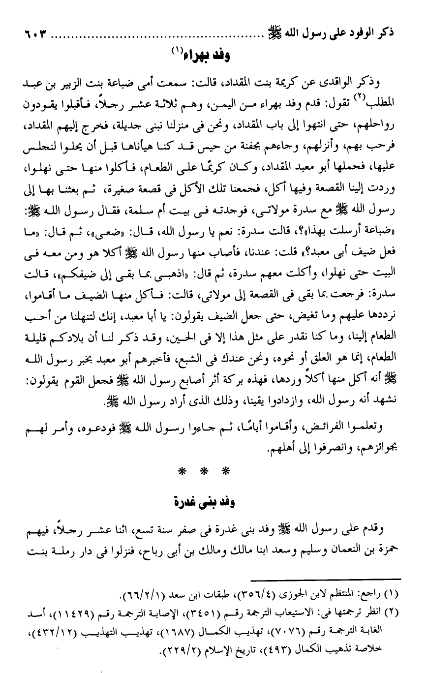 وذكر الواقدى عن كريمة بنت المقداد، قالت: سمعت أمى ضباعة بنت الزبير بن عبد المطلب «2» تقول: قدم وفد بهراء من اليمن، وهم ثلاثة عشر رجلا، فأقبلوا يقودون رواحلهم، حتى انتهوا إلى باب المقداد، ونحن فى منزلنا نبنى جديلة، فخرج إليهم المقداد، فرحب بهم، وأنزلهم، وجاءهم بجفنة من حيس قد كنا هيأناها قبل أن يحلوا لنجلس عليها، فحملها أبو معبد المقداد، وكان كريما على الطعام، فأكلوا منها حتى نهلوا، وردت إلينا القصعة وفيها أكل، فجمعنا تلك الأكل فى قصعة صغيرة، ثم بعثنا بها إلى رسول الله صلى الله عليه وسلم مع سدرة مولاتى، فوجدته فى بيت أم سلمة، فقال رسول الله صلى الله عليه وسلم: