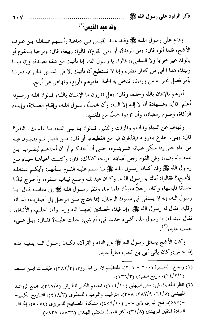 قال: «بلى، جذع ينقرونه فيقذفون فيه من القطيعاء، أو قال: من التمر ثم يصبون فيه من الماء حتى إذا سكن غليانه شربتموه، حتى أن أحدكم أو أن أحدهم ليضرب ابن عمه بالسيف» ، وفى القوم رجل أصابته جراحه كذلك، قال: وكنت أخبأها حياء من رسول الله صلى الله عليه وسلم وقد كان رسول الله صلى الله عليه وسلم لما سلم عليه القوم سألهم: «أيكم عبد الله الأشج» ؟ فقالوا: أتاك يا رسول الله. وكان عبد الله وضع ثياب سفره، وأخرج ثيابا حسانا فلبسها، وكان رجلا دميما، فلما جاء ونظر رسول الله صلى الله عليه وسلم إلى دمامته قال: يا رسول الله، إنه لا يستقى فى مسوك الرجال، إنما يحتاج من الرجل إلى أصغريه، لسانه وقلبه. فقال له رسول الله صلى الله عليه وسلم: «إن فيك لخصلتين يحبهما الله ورسوله: الحلم، والأناة» .