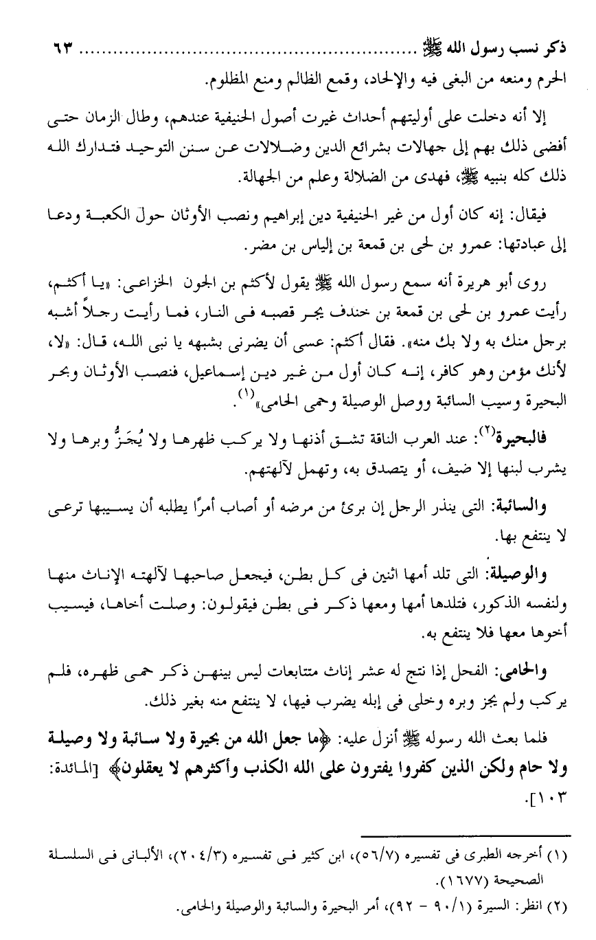 (2) انظر: السيرة (1/ 90- 92) ، أمر البحيرة والسائبة والوصيلة والحامى.