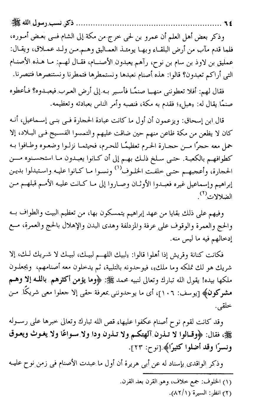 فكانت كنانة وقريش إذا أهلوا قالوا: «لبيك اللهم لبيك، لبيك لا شريك لك، إلا شريك هو لك تملكه وما ملك» ، فيوحدونه بالتلبية، ثم يدخلون معه أصنامهم، ويجعلون ملكها بيده! يقول الله تبارك وتعالى لنبيه محمد صلى الله عليه وسلم: وَما يُؤْمِنُ أَكْثَرُهُمْ بِاللَّهِ إِلَّا وَهُمْ مُشْرِكُونَ [يوسف: 106] ، أى ما يوحدوننى بمعرفة حقى إلا جعلوا معى شريكا من خلقى.