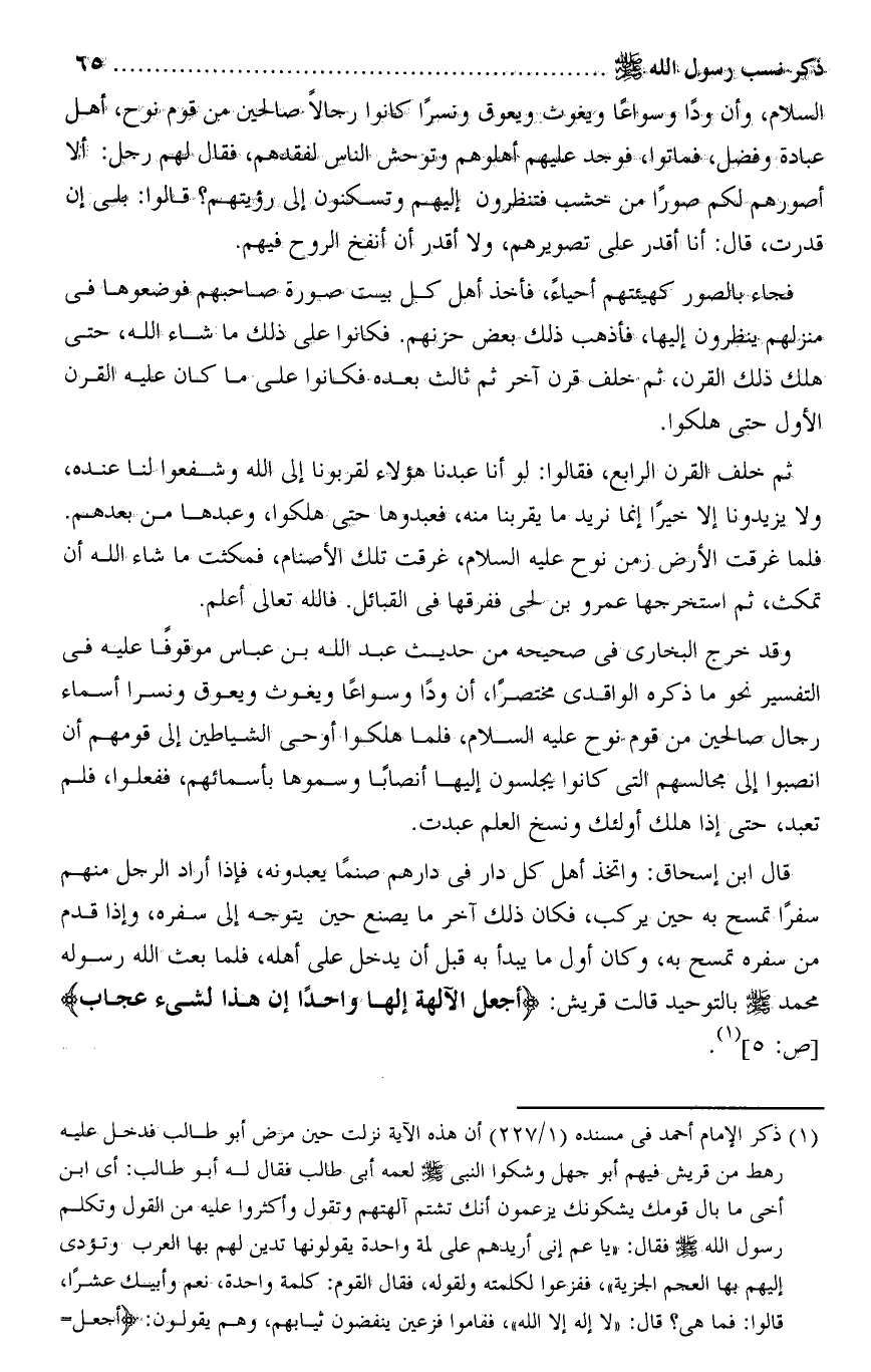 وقد خرج البخارى فى صحيحه من حديث عبد الله بن عباس موقوفا عليه فى التفسير نحو ما ذكره الواقدى مختصرا، أن ودا وسواعا ويغوث ويعوق ونسرا أسماء رجال صالحين من قوم نوح عليه السلام، فلما هلكوا أوحى الشياطين إلى قومهم أن انصبوا إلى مجالسهم التى كانوا يجلسون إليها أنصابا وسموها بأسمائهم، ففعلوا، فلم تعبد، حتى إذا هلك أولئك ونسخ العلم عبدت.