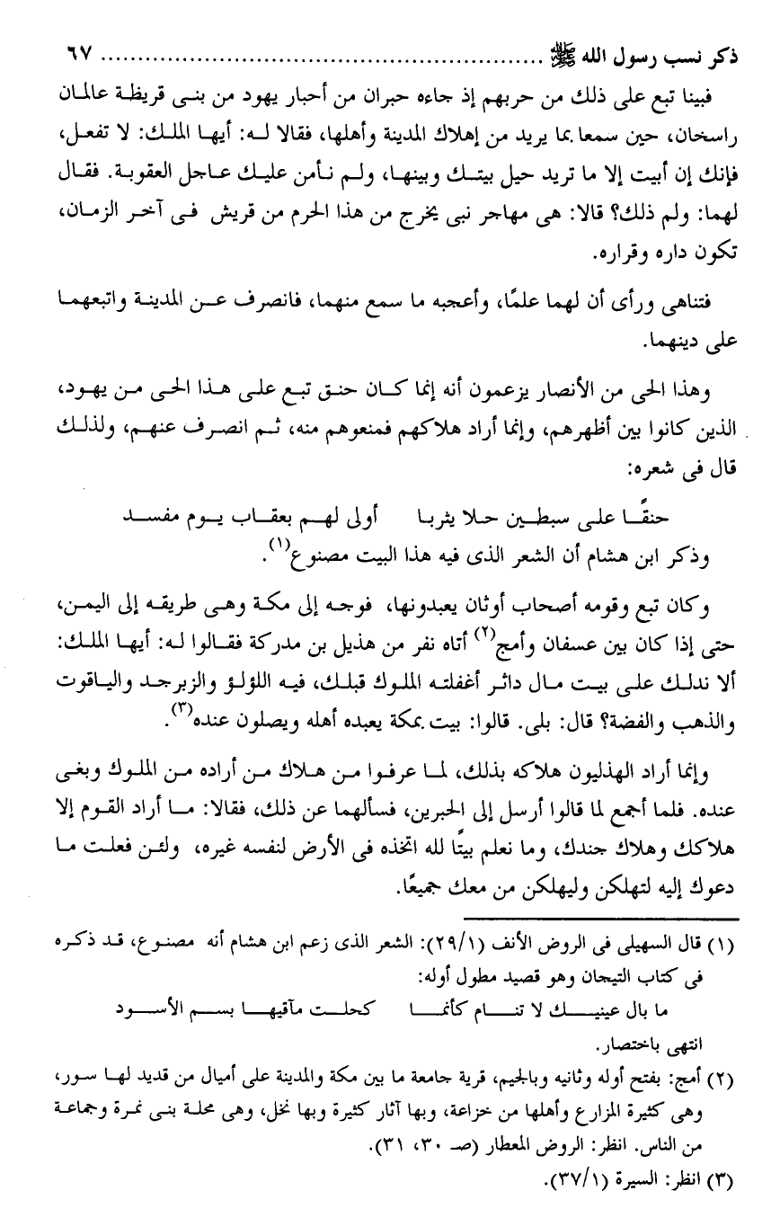 (1) قال السهيلى فى الروض الأنف (1/ 29) : الشعر الذى زعم ابن هشام أنه مصنوع، قد ذكره فى كتاب التيجان وهو قصيد مطول أوله: