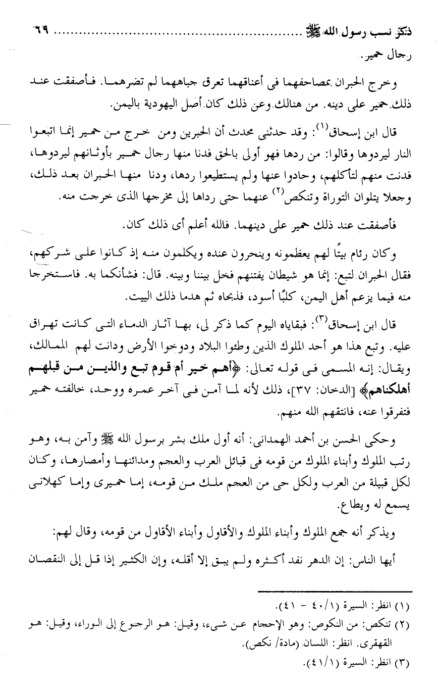 قال ابن إسحاق «1» : وقد حدثنى محدث أن الحبرين ومن خرج من حمير إنما اتبعوا النار ليردوها وقالوا: من ردها فهو أولى بالحق فدنا منها رجال حمير بأوثانهم ليردوها، فدنت منهم لتأكلهم، وحادوا عنها ولم يستطيعوا ردها، ودنا منها الحبران بعد ذلك، وجعلا يتلوان التوراة وتنكص «2» عنهما حتى رداها إلى مخرجها الذى خرجت منه.