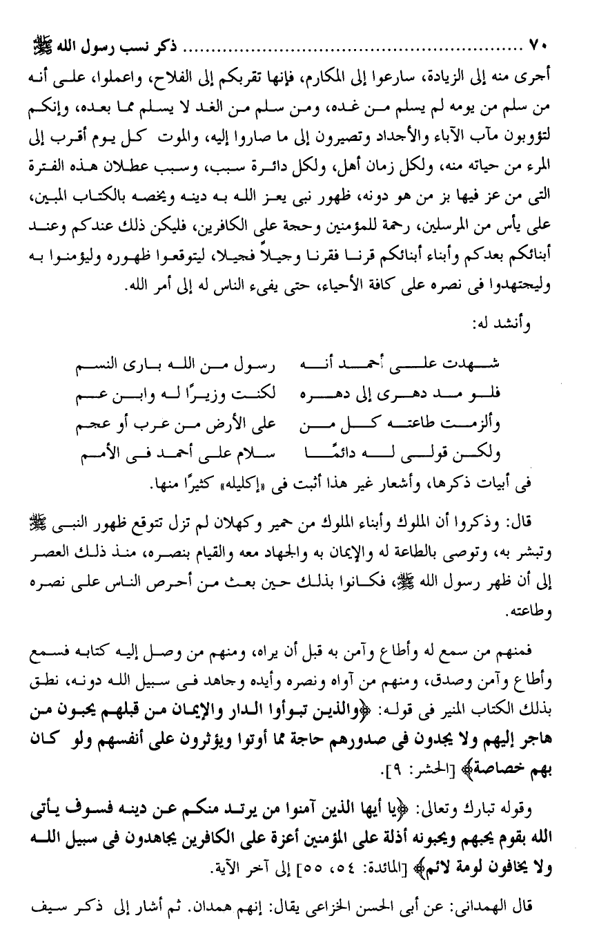 قال: وذكروا أن الملوك وأبناء الملوك من حمير وكهلان لم تزل تتوقع ظهور النبى صلى الله عليه وسلم وتبشر به، وتوصى بالطاعة له والإيمان به والجهاد معه والقيام بنصره، منذ ذلك العصر إلى أن ظهر رسول الله صلى الله عليه وسلم، فكانوا بذلك حين بعث من أحرص الناس على نصره وطاعته.