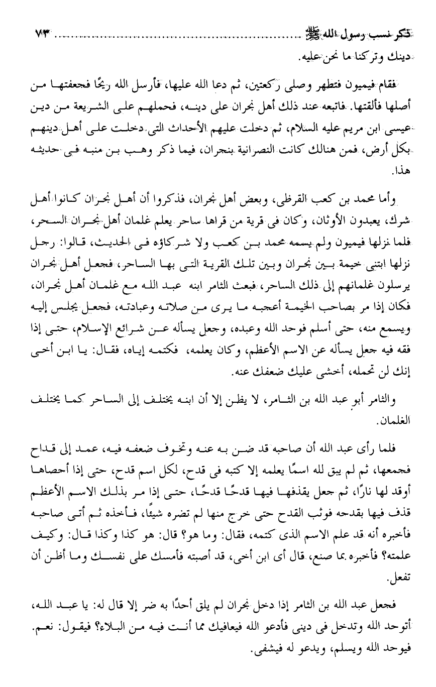 وأما محمد بن كعب القرظى، وبعض أهل نجران، فذكروا أن أهل نجران كانوا أهل شرك، يعبدون الأوثان، وكان فى قرية من قراها ساحر يعلم غلمان أهل نجران السحر، فلما نزلها فيميون ولم يسمه محمد بن كعب ولا شركاؤه فى الحديث، قالوا: رجل نزلها ابتنى خيمة بين نجران وبين تلك القرية التى بها الساحر، فجعل أهل نجران يرسلون غلمانهم إلى ذلك الساحر، فبعث الثامر ابنه عبد الله مع غلمان أهل نجران، فكان إذا مر بصاحب الخيمة أعجبه ما يرى من صلاته وعبادته، فجعل يجلس إليه ويسمع منه، حتى أسلم فوحد الله وعبده، وجعل يسأله عن شرائع الإسلام، حتى إذا فقه فيه جعل يسأله عن الاسم الأعظم، وكان يعلمه، فكتمه إياه، فقال: يا ابن أخى إنك لن تحمله، أخشى عليك ضعفك عنه.