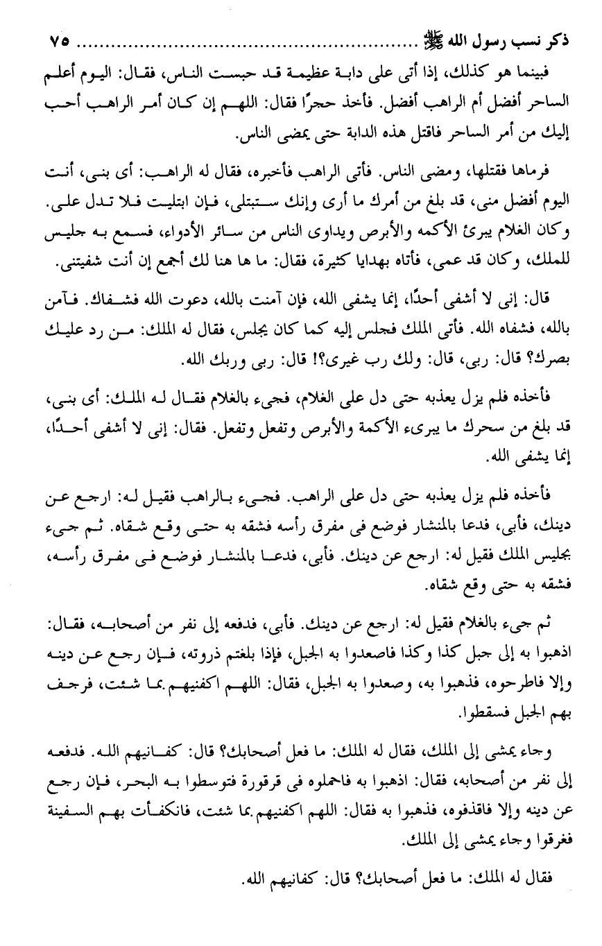 فأخذه فلم يزل يعذبه حتى دل على الغلام، فجىء بالغلام فقال له الملك: أى بنى، قد بلغ من سحرك ما يبرىء الأكمة والأبرص وتفعل وتفعل. فقال: إنى لا أشفى أحدا، إنما يشفى الله.