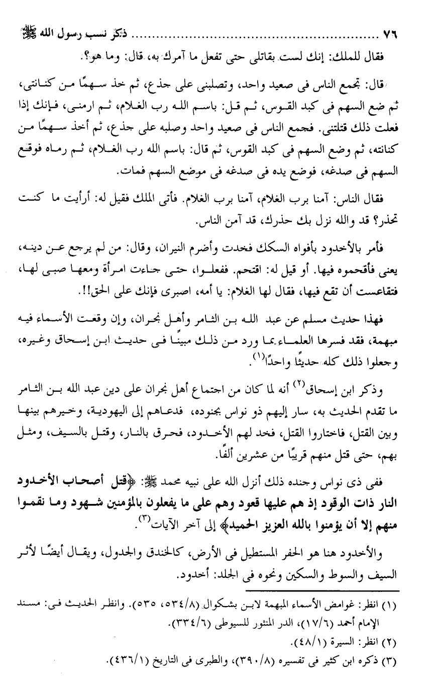 فهذا حديث مسلم عن عبد الله بن الثامر وأهل نجران، وإن وقعت الأسماء فيه مبهمة، فقد فسرها العلماء بما ورد من ذلك مبينا فى حديث ابن إسحاق وغيره، وجعلوا ذلك كله حديثا واحدا «1» .