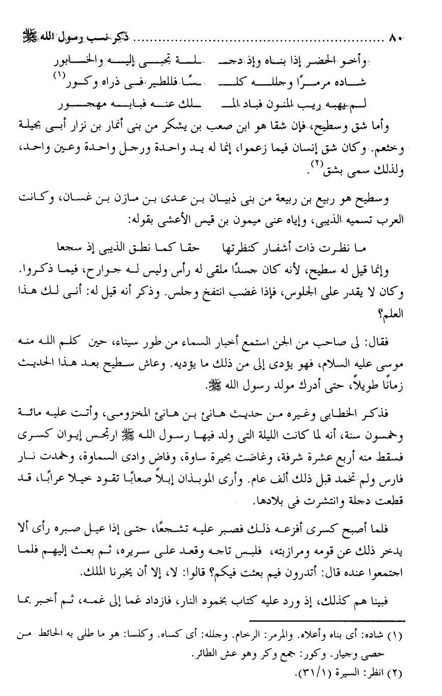 فقال: لى صاحب من الجن استمع أخبار السماء من طور سيناء، حين كلم الله منه موسى عليه السلام، فهو يؤدى إلى من ذلك ما يؤديه. وعاش سطيح بعد هذا الحديث زمانا طويلا، حتى أدرك مولد رسول الله صلى الله عليه وسلم.