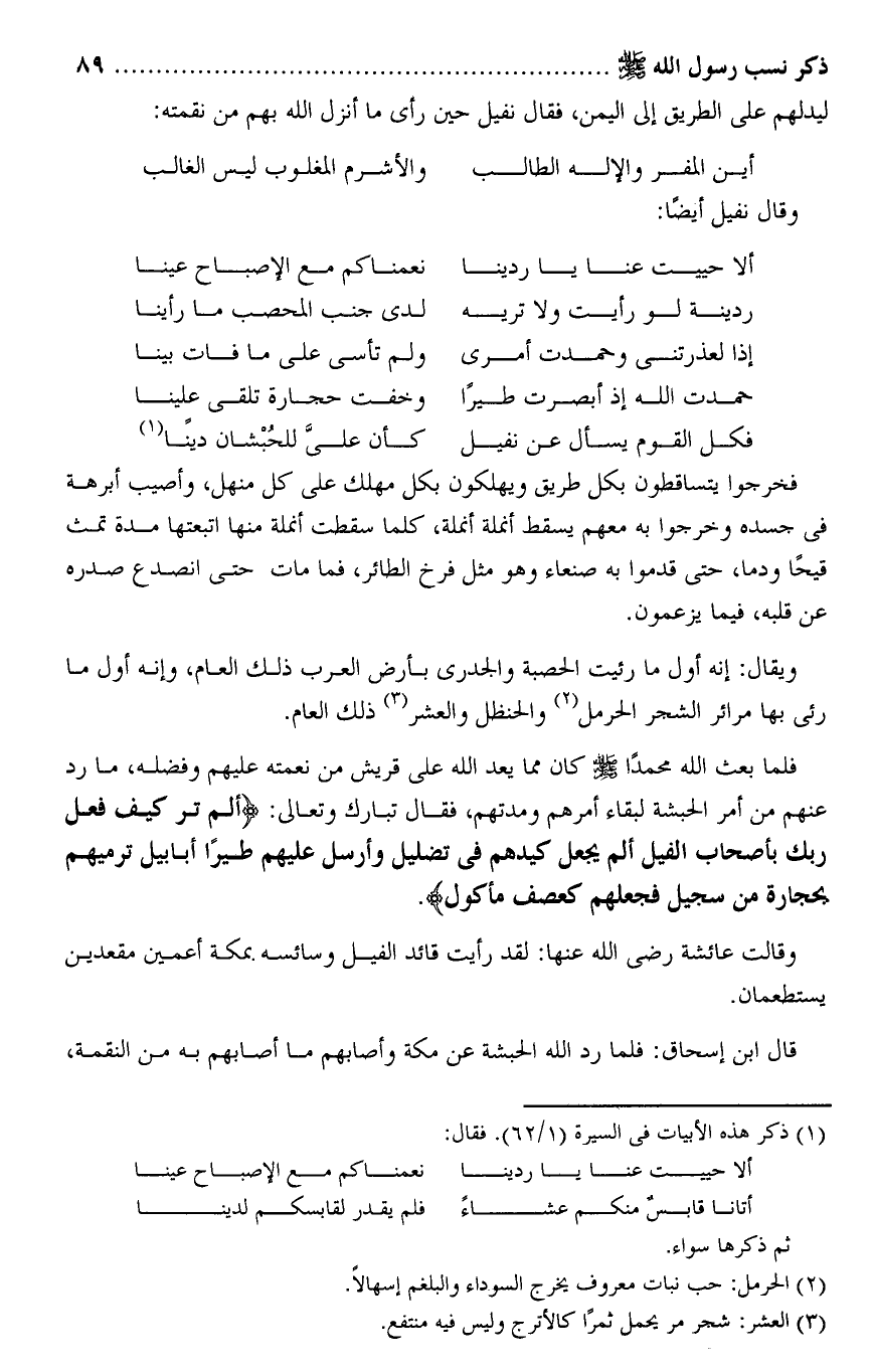 فلما بعث الله محمدا صلى الله عليه وسلم كان مما يعد الله على قريش من نعمته عليهم وفضله، ما رد عنهم من أمر الحبشة لبقاء أمرهم ومدتهم، فقال تبارك وتعالى: أَلَمْ تَرَ كَيْفَ فَعَلَ رَبُّكَ بِأَصْحابِ الْفِيلِ أَلَمْ يَجْعَلْ كَيْدَهُمْ فِي تَضْلِيلٍ وَأَرْسَلَ عَلَيْهِمْ طَيْراً أَبابِيلَ تَرْمِيهِمْ بِحِجارَةٍ مِنْ سِجِّيلٍ فَجَعَلَهُمْ كَعَصْفٍ مَأْكُولٍ.
