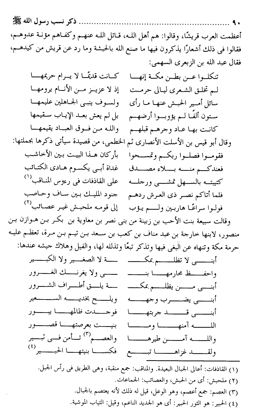 وقالت سبيعة بنت الأحب بن زبينة من بنى نصر بن معاوية بن بكر بن هوازن بن منصور، لابنها خارجة بن عبد مناف بن كعب بن سعد بن تيم بن مرة، تعظم عليه حرمة مكة وتنهاه عن البغى فيها وتذكر تبعا وتذلله لها، والفيل وهلاك جيشه عندها:
