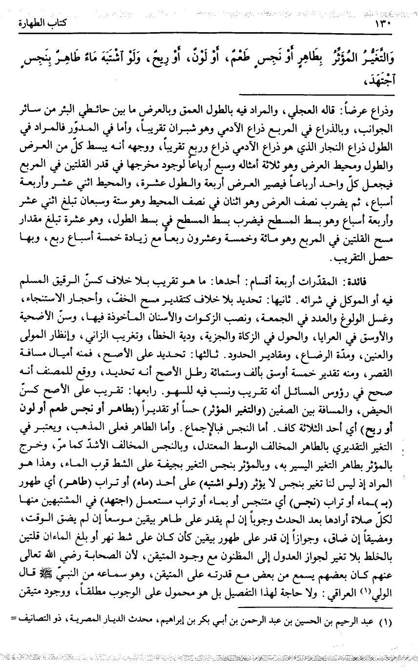 وَالتَّغَيُّرُ الْمُؤَثَّرُ بِطَاهِرٍ أَوْ نَجِسٍ طَعْمٌ، أَوْ لَوْنٌ، أَوْ رِيحٌ، وَلَوْ اشْتَبَهَ مَاءٌ طَاهِرٌ بِنَجِسٍ اجْتَهَدَ.