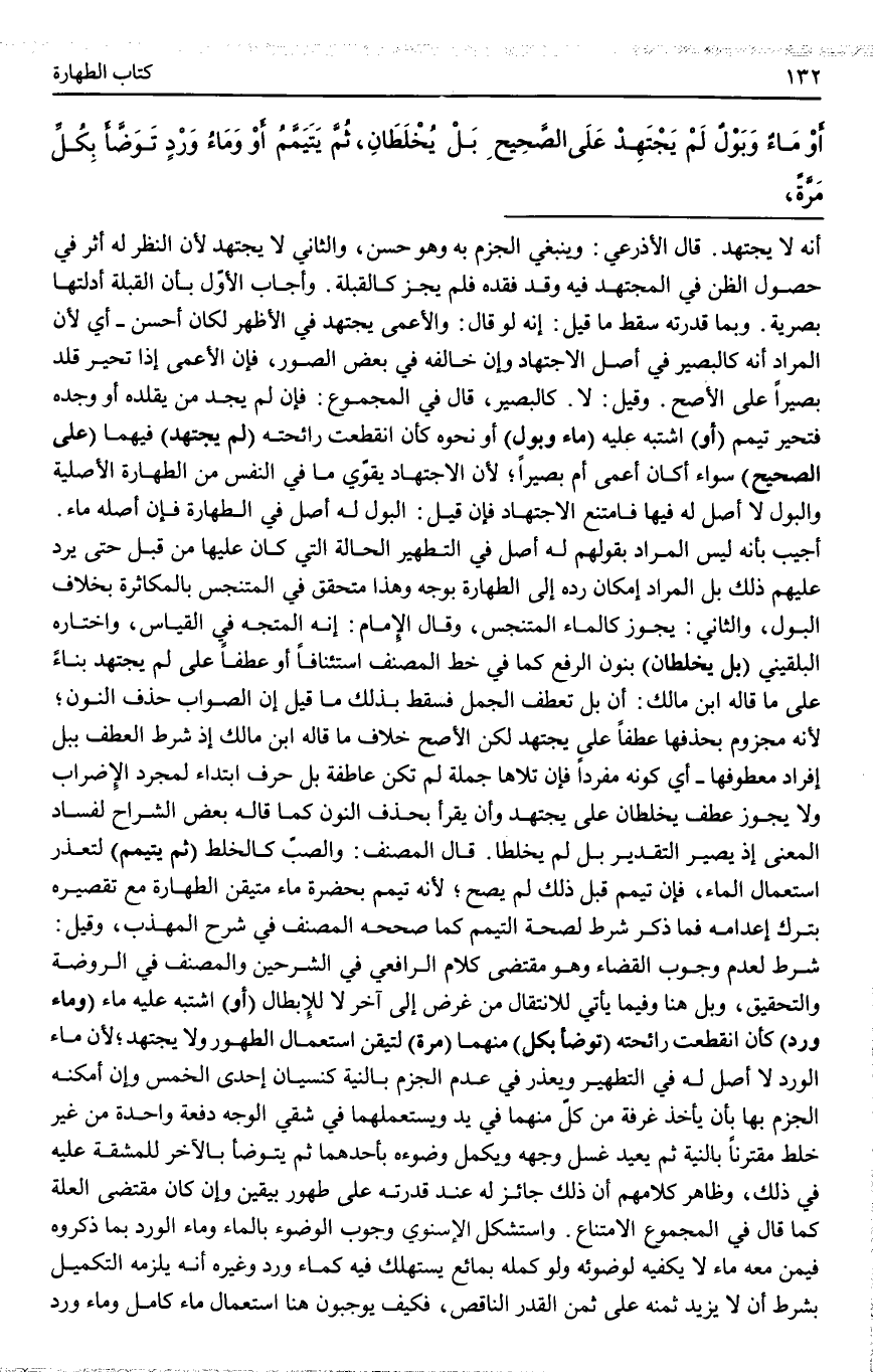 (أَوْ) اشْتَبَهَ عَلَيْهِ (مَاءٌ وَبَوْلٌ) أَوْ نَحْوُهُ كَأَنْ انْقَطَعَتْ رَائِحَتُهُ (لَمْ يَجْتَهِدْ) فِيهِمَا (عَلَى الصَّحِيحِ) سَوَاءٌ أَكَانَ أَعْمَى أَمْ بَصِيرًا؛ لِأَنَّ الِاجْتِهَادَ يُقَوِّي مَا فِي النَّفْسِ مِنْ الطَّهَارَةِ الْأَصْلِيَّةِ وَالْبَوْلُ لَا أَصْلَ لَهُ فِيهَا فَامْتَنَعَ الِاجْتِهَادُ فَإِنْ قِيلَ: الْبَوْلُ لَهُ أَصْلٌ فِي الطَّهَارَةِ فَإِنَّ أَصْلَهُ مَاءٌ.