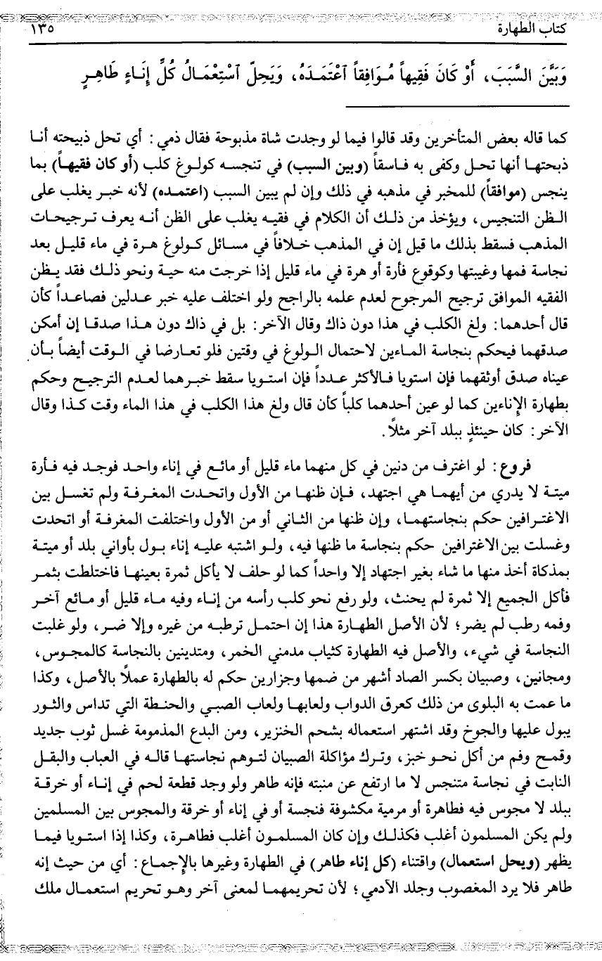 وَلَوْ غَلَبَتْ النَّجَاسَةُ فِي شَيْءٍ، وَالْأَصْلُ فِيهِ الطَّهَارَةُ كَثِيَابِ مُدْمِنِي الْخَمْرِ، وَمُتَدَيِّنِينَ بِالنَّجَاسَةِ كَالْمَجُوسِ، وَمَجَانِينَ، وَصِبْيَانٍ بِكَسْرِ الصَّادِ أَشْهُرُ مِنْ ضَمِّهَا وَجَزَّارِينَ حُكِمَ لَهُ بِالطَّهَارَةِ عَمَلًا بِالْأَصْلِ، وَكَذَا مَا عَمَّتْ بِهِ الْبَلْوَى مِنْ ذَلِكَ كَعَرَقِ الدَّوَابِّ وَلُعَابِهَا وَلُعَابِ الصَّبِيِّ وَالْحِنْطَةِ الَّتِي تُدَاسُ، وَالثَّوْرُ يَبُولُ عَلَيْهَا وَالْجُوخُ، وَقَدْ اشْتَهَرَ اسْتِعْمَالُهُ بِشَحْمِ الْخِنْزِيرِ، وَمِنْ الْبِدَعِ الْمَذْمُومَةِ غَسْلُ ثَوْبٍ جَدِيدٍ وَقَمْحٍ وَفَمٍ مِنْ أَكْلِ نَحْوِ خُبْزٍ، وَتَرْكُ مُؤَاكَلَةِ الصِّبْيَانِ لِتَوَهُّمِ نَجَاسَتِهَا قَالَهُ فِي الْعُبَابِ وَالْبَقْلُ النَّابِتُ فِي نَجَاسَةٍ مُتَنَجِّسٌ لَا مَا ارْتَفَعَ عَنْ مَنْبَتِهِ فَإِنَّهُ طَاهِرٌ، وَلَوْ وَجَدَ قِطْعَةَ لَحْمٍ فِي إنَاءٍ أَوْ خِرْقَةٍ بِبَلَدٍ لَا مَجُوسَ فِيهِ فَطَاهِرَةٌ، أَوْ مَرْمِيَّةً مَكْشُوفَةً فَنَجِسَةٌ أَوْ فِي إنَاءٍ أَوْ خِرْقَةٍ وَالْمَجُوسُ بَيْنَ الْمُسْلِمِينَ وَلَمْ يَكُنْ الْمُسْلِمُونَ أَغْلَبَ فَكَذَلِكَ وَإِنْ كَانَ الْمُسْلِمُونَ أَغْلَبَ فَطَاهِرَةٌ وَكَذَا إذَا اسْتَوَيَا فِيمَا يَظْهَرُ