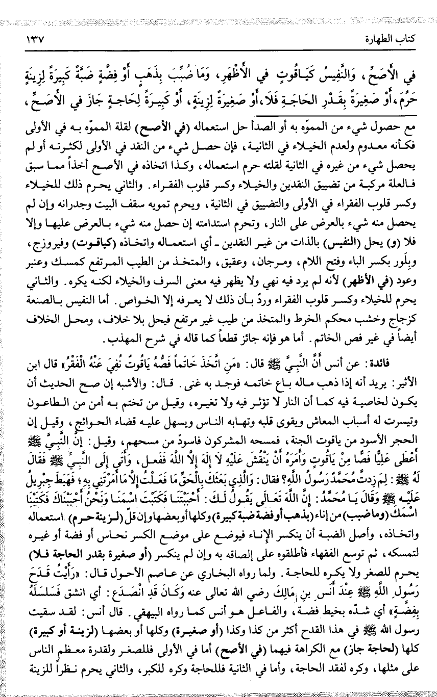 وَلِمَا رَوَاهُ الْبُخَارِيُّ عَنْ عَاصِمٍ الْأَحْوَلِ قَالَ: «رَأَيْتُ قَدَحَ رَسُولِ اللَّهِ - صَلَّى اللَّهُ عَلَيْهِ وَسَلَّمَ - عِنْدَ أَنَسِ بْنِ مَالِكٍ - رَضِيَ اللَّهُ تَعَالَى عَنْهُ - وَكَانَ قَدْ انْصَدَعَ: أَيْ: انْشَقَّ فَسَلْسَلَهُ بِفِضَّةٍ» أَيْ شَدَّهُ بِخَيْطِ فِضَّةٍ، وَالْفَاعِلُ هُوَ أَنَسٌ كَمَا رَوَاهُ الْبَيْهَقِيُّ. قَالَ أَنَسٌ: لَقَدْ سَقَيْتُ رَسُولَ اللَّهِ - صَلَّى اللَّهُ عَلَيْهِ وَسَلَّمَ - فِي هَذَا الْقَدَحِ أَكْثَرَ مِنْ كَذَا وَكَذَا (أَوْ صَغِيرَةً) وَكُلُّهَا أَوْ بَعْضُهَا (لِزِينَةٍ أَوْ كَبِيرَةً) كُلُّهَا (لِحَاجَةٍ جَازَ) مَعَ الْكَرَاهَةِ فِيهِمَا (فِي الْأَصَحِّ) أَمَّا فِي الْأُولَى فَلِلصِّغَرِ وَلِقُدْرَةِ مُعْظَمِ النَّاسِ عَلَى مِثْلِهَا، وَكُرِهَ لِفَقْدِ الْحَاجَةِ، وَأَمَّا فِي الثَّانِيَةِ فَلِلْحَاجَةِ وَكُرِهَ لِلْكِبَرِ، وَالثَّانِي يَحْرُمُ نَظَرًا لِلزِّينَةِ