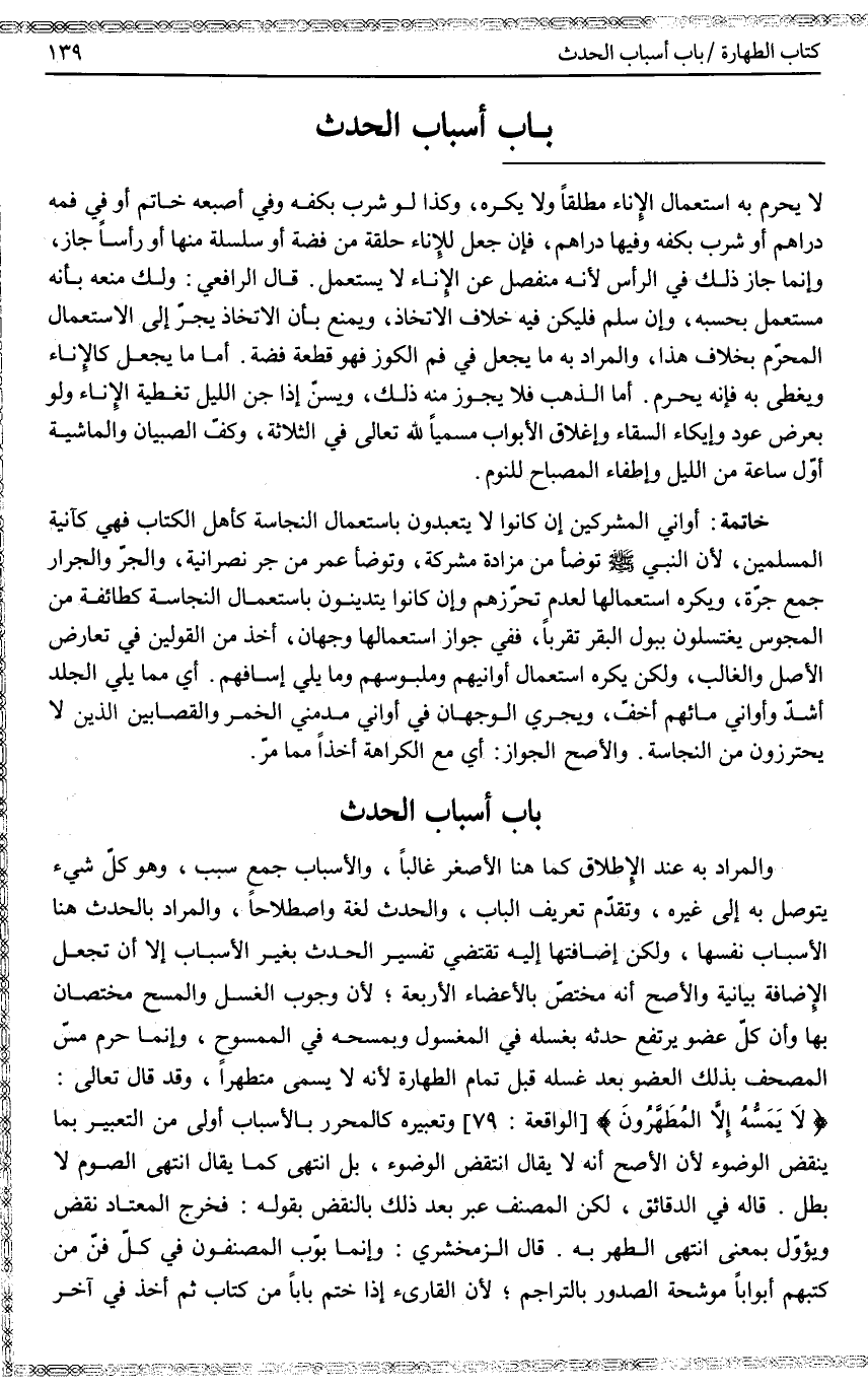 ِ وَالْمُرَادُ بِهِ عِنْدَ الْإِطْلَاقِ كَمَا هُنَا الْأَصْغَرُ غَالِبًا، وَالْأَسْبَابُ جَمْعُ سَبَبٍ، وَهُوَ كُلُّ شَيْءٍ يُتَوَصَّلُ بِهِ إلَى غَيْرِهِ، وَتَقَدَّمَ تَعْرِيفُ الْبَابِ، وَالْحَدَثِ لُغَةً وَاصْطِلَاحًا، وَالْمُرَادُ بِالْحَدَثِ هُنَا الْأَسْبَابُ نَفْسُهَا، وَلَكِنَّ إضَافَتَهَا إلَيْهِ تَقْتَضِي تَفْسِيرَ الْحَدَثِ بِغَيْرِ الْأَسْبَابِ إلَّا أَنْ تُجْعَلَ الْإِضَافَةُ بَيَانِيَّةً وَالْأَصَحُّ أَنَّهُ مُخْتَصٌّ بِالْأَعْضَاءِ الْأَرْبَعَةِ؛ لِأَنَّ وُجُوبَ الْغَسْلِ وَالْمَسْحِ مُخْتَصَّانِ بِهَا، وَأَنَّ كُلَّ عُضْوٍ يَرْتَفِعُ حَدَثُهُ بِغَسْلِهِ فِي الْمَغْسُولِ وَبِمَسْحِهِ فِي الْمَمْسُوحِ، وَإِنَّمَا حَرُمَ مَسُّ الْمُصْحَفِ بِذَلِكَ الْعُضْوِ بَعْدَ غَسْلِهِ قَبْلَ تَمَامِ الطَّهَارَةِ؛ لِأَنَّهُ لَا يُسَمَّى مُتَطَهِّرًا، وَقَدْ قَالَ تَعَالَى: {لا يَمَسُّهُ إِلا الْمُطَهَّرُونَ} [الواقعة: 79] [الْوَاقِعَةُ] وَتَعْبِيرُهُ كَالْمُحَرَّرِ بِالْأَسْبَابِ أَوْلَى مِنْ التَّعْبِيرِ بِمَا يَنْقُضُ الْوُضُوءَ؛ لِأَنَّ الْأَصَحَّ أَنَّهُ لَا يُقَالُ: انْتَقَضَ الْوُضُوءُ، بَلْ انْتَهَى كَمَا يُقَالُ انْتَهَى الصَّوْمُ لَا بَطَلَ. قَالَهُ فِي الدَّقَائِقِ، لَكِنَّ الْمُصَنِّفُ عَبَّرَ بَعْدَ ذَلِكَ بِالنَّقْضِ بِقَوْلِهِ: فَخَرَجَ الْمُعْتَادُ نُقِضَ وَيُؤَوَّلُ بِمَعْنَى انْتَهَى الطُّهْرُ بِهِ. قَالَ الزَّمَخْشَرِيُّ: وَإِنَّمَا بَوَّبَ الْمُصَنِّفُونَ فِي كُلِّ فَنٍّ مِنْ كُتُبِهِمْ أَبْوَابًا مُوَشَّحَةَ الصُّدُورِ بِالتَّرَاجِمِ؛ لِأَنَّ الْقَارِئَ إذَا خَتَمَ بَابًا مِنْ كِتَابٍ ثُمَّ أَخَذَ فِي آخَرَ