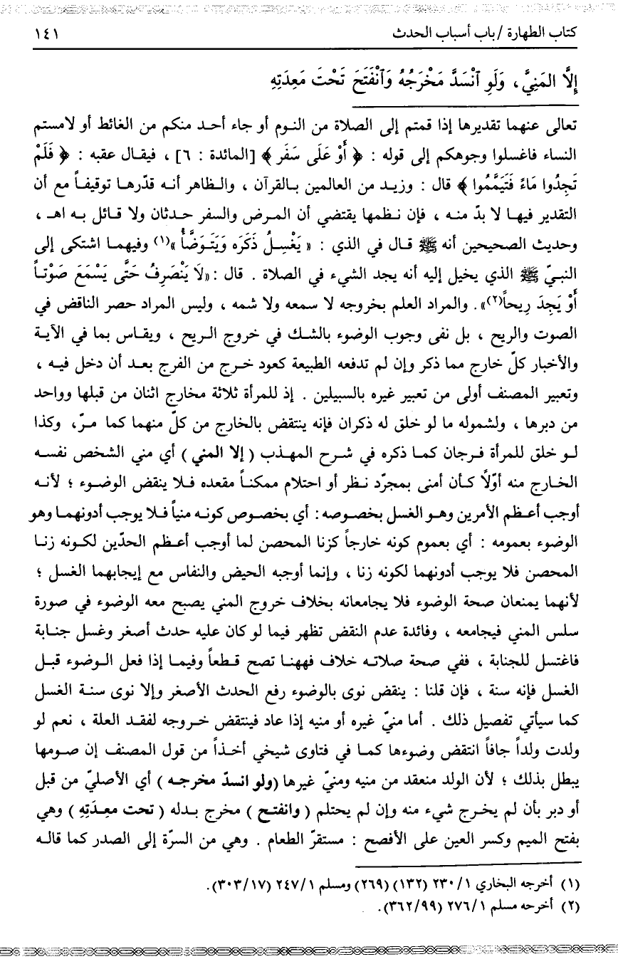 وَحَدِيثُ الصَّحِيحَيْنِ أَنَّهُ - صَلَّى اللَّهُ عَلَيْهِ وَسَلَّمَ - قَالَ فِي الَّذِي: «يَغْسِلُ ذَكَرَهُ وَيَتَوَضَّأُ» وَفِيهِمَا اشْتَكَى إلَى النَّبِيِّ - صَلَّى اللَّهُ عَلَيْهِ وَسَلَّمَ - الَّذِي يُخَيَّلُ إلَيْهِ أَنَّهُ يَجِدُ الشَّيْءَ فِي الصَّلَاةِ. قَالَ: «لَا يَنْصَرِفْ حَتَّى يَسْمَعَ صَوْتًا أَوْ يَجِدَ رِيحًا» . وَالْمُرَادُ الْعِلْمُ بِخُرُوجِهِ لَا سَمْعُهُ، وَلَا شَمُّهُ، وَلَيْسَ الْمُرَادُ حَصْرَ النَّاقِضِ فِي الصَّوْتِ وَالرِّيحِ، بَلْ نَفَى وُجُوبَ الْوُضُوءِ بِالشَّكِّ فِي خُرُوجِ الرِّيحِ، وَيُقَاسُ بِمَا فِي الْآيَةِ وَالْأَخْبَارِ كُلُّ خَارِجٍ مِمَّا ذُكِرَ، وَإِنْ لَمْ تَدْفَعُهُ الطَّبِيعَةُ كَعُودٍ خَرَجَ مِنْ الْفَرْجِ بَعْدَ أَنْ دَخَلَ فِيهِ، وَتَعْبِيرُ الْمُصَنِّفُ أَوْلَى مِنْ تَعْبِيرِ غَيْرِهِ بِالسَّبِيلَيْنِ؛ إذْ لِلْمَرْأَةِ ثَلَاثَةُ مَخَارِجَ اثْنَانِ مِنْ قُبُلِهَا وَوَاحِدٌ مِنْ دُبُرِهَا، وَلِشُمُولِهِ مَا لَوْ خُلِقَ لَهُ ذَكَرَانِ فَإِنَّهُ يَنْتَقِضُ بِالْخَارِجِ مِنْ كُلٍّ مِنْهُمَا كَمَا مَرَّ، وَكَذَا لَوْ خُلِقَ لِلْمَرْأَةِ فَرْجَانِ كَمَا ذَكَرَهُ فِي شَرْحِ الْمُهَذَّبِ (إلَّا الْمَنِيَّ) أَيْ مَنِيَّ الشَّخْصِ نَفْسِهِ الْخَارِجَ مِنْهُ أَوَّلًا كَأَنْ أَمْنَى بِمُجَرَّدِ نَظَرٍ أَوْ احْتِلَامٍ مُمَكِّنًا مَقْعَدُهُ فَلَا يُنْقَضُ الْوُضُوءُ؛ لِأَنَّهُ أَوْجَبَ أَعْظَمَ الْأَمْرَيْنِ، وَهُوَ الْغُسْلَ بِخُصُوصِهِ: أَيْ بِخُصُوصِ كَوْنِهِ مَنِيًّا فَلَا يُوجِبُ أَدْوَنَهُمَا، وَهُوَ الْوُضُوءُ بِعُمُومِهِ: أَيْ بِعُمُومِ كَوْنِهِ خَارِجًا كَزِنَا الْمُحْصَنِ لِمَا أَوْجَبَ أَعْظَمَ الْحَدَّيْنِ لِكَوْنِهِ زِنَا الْمُحْصَنِ فَلَا يُوجِبُ أَدْوَنَهُمَا لِكَوْنِهِ زِنًا، وَإِنَّمَا أَوْجَبَهُ الْحَيْضُ وَالنِّفَاسُ مَعَ إيجَابِهِمَا الْغُسْلَ؛ لِأَنَّهُمَا يَمْنَعَانِ صِحَّةَ الْوُضُوءِ فَلَا يُجَامِعَانِهِ بِخِلَافِ خُرُوجِ الْمَنِيِّ يُصْبِحُ مَعَهُ الْوُضُوءُ فِي صُورَةِ سَلَسِ الْمَنِيِّ فَيُجَامِعُهُ، وَفَائِدَةُ عَدَمِ النَّقْضِ تَظْهَرُ فِيمَا لَوْ كَانَ عَلَيْهِ حَدَثٌ أَصْغَرُ وَغُسْلُ جَنَابَةٍ فَاغْتَسَلَ لِلْجَنَابَةِ، فَفِي صِحَّةِ صَلَاتِهِ خِلَافٌ فَهَاهُنَا تَصِحُّ قَطْعًا، وَفِيمَا إذَا فَعَلَ الْوُضُوءَ قَبْلَ الْغُسْلِ فَإِنَّهُ سُنَّةٌ، فَإِنْ قُلْنَا: يُنْقَضُ نَوَى بِالْوُضُوءِ رَفْعَ الْحَدَثِ الْأَصْغَرِ، وَإِلَّا نَوَى سُنَّةَ الْغُسْلِ كَمَا سَيَأْتِي تَفْصِيلُ ذَلِكَ. أَمَّا مَنِيُّ غَيْرِهِ أَوْ مَنِيُّهُ إذَا عَادَ فَيَنْتَقِضُ خُرُوجُهُ لِفَقْدِ الْعِلَّةِ، نَعَمْ لَوْ وَلَدَتْ وَلَدًا جَافًّا انْتَقَضَ وُضُوءُهَا كَمَا فِي فَتَاوَى شَيْخِي أَخَذًا مِنْ قَوْلِ الْمُصَنِّفُ: إنَّ صَوْمَهَا يَبْطُلُ بِذَلِكَ؛ لِأَنَّ الْوَلَدَ مُنْعَقِدٌ مِنْ مَنِيِّهِ وَمَنِيِّ غَيْرِهَا (وَلَوْ انْسَدَّ مَخْرَجُهُ) أَيْ الْأَصْلِيُّ مِنْ قُبُلٍ أَوْ دُبُرٍ بِأَنْ لَمْ يَخْرُجْ شَيْءٌ مِنْهُ، وَإِنْ لَمْ يَحْتَلِمْ (وَانْفَتَحَ) مَخْرَجٌ بَدَلَهُ (تَحْتَ مَعِدَتِهِ) وَهِيَ بِفَتْحِ الْمِيمِ وَكَسْرِ الْعَيْنِ عَلَى الْأَفْصَحِ: مُسْتَقَرُّ الطَّعَامِ. وَهِيَ مِنْ السُّرَّةِ إلَى الصَّدْرِ كَمَا قَالَهُ