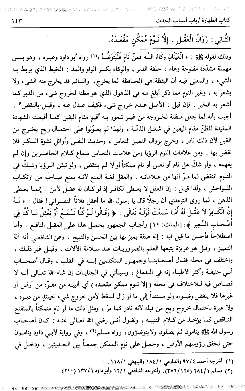 وَأَجَابَ الْجُمْهُورِ بِحَمْلِ هَذَا عَلَى الْعَقْلِ النَّافِعِ. وَأَمَّا اصْطِلَاحًا فَأَحْسَنُ مَا قِيلَ فِيهِ: إنَّهُ صِفَةٌ يُمَيِّزُ بِهَا بَيْنَ الْحَسَنِ وَالْقَبِيحِ، وَعَنْ الشَّافِعِيِّ أَنَّهُ آلَةُ التَّمْيِيزِ، وَقِيلَ هُوَ غَرِيزَةٌ يَتْبَعُهَا الْعِلْمُ بِالضَّرُورِيَّاتِ عِنْدَ سَلَامَةِ الْآلَاتِ، وَقِيلَ: غَيْرُ ذَلِكَ، وَاخْتُلِفَ فِي مَحَلِّهِ فَقَالَ أَصْحَابُنَا وَجُمْهُورُ الْمُتَكَلِّمِينَ إنَّهُ فِي الْقَلْبِ، وَقَالَ أَصْحَابُ أَبِي حَنِيفَةَ وَأَكْثَرُ الْأَطِبَّاءِ: إنَّهُ فِي الدِّمَاغِ، وَسَيَأْتِي فِي الْجِنَايَاتِ إنْ شَاءَ اللَّهُ تَعَالَى أَنَّهُ لَا قِصَاصَ فِيهِ لِلِاخْتِلَافِ فِي مَحَلِّهِ (إلَّا نَوْمَ مُمَكِّنٍ مَقْعَدَهُ) أَيْ أَلْيَيْهِ مِنْ مَقَرِّهِ مِنْ أَرْضٍ أَوْ غَيْرِهَا فَلَا يُنْقَضُ وُضُوءُهُ، وَلَوْ مُسْتَنِدًا إلَى مَا لَوْ زَالَ لَسَقَطَ لِأَمْنِ خُرُوجِ شَيْءٍ حِينَئِذٍ مِنْ دُبُرِهِ، وَلَا عِبْرَةَ بِاحْتِمَالِ خُرُوجِ رِيحٍ مِنْ قُبُلِهِ؛ لِأَنَّهُ نَادِرٌ كَمَا مَرَّ، وَمِثْلُ ذَلِكَ مَا لَوْ نَامَ مُتَمَكِّنًا بِالْمُنْفَتِحِ النَّاقِضِ كَمَا يُؤْخَذُ مِنْ كَلَامِ التَّنْبِيهِ، وَلِقَوْلِ أَنَسٍ - رَضِيَ اللَّهُ تَعَالَى عَنْهُ -: كَانَ أَصْحَابُ رَسُولِ اللَّهِ - صَلَّى اللَّهُ عَلَيْهِ وَسَلَّمَ - يَنَامُونَ ثُمَّ يُصَلُّونَ وَلَا يَتَوَضَّئُونَ، رَوَاهُ مُسْلِمٌ (2) ، وَفِي رِوَايَةٍ لِأَبِي دَاوُد يَنَامُونَ حَتَّى تَخْفُقَ رُءُوسُهُمْ الْأَرْضَ، وَحُمِلَ عَلَى نَوْمِ الْمُمَكِّنِ جَمْعًا بَيْنَ الْحَدِيثَيْنِ.