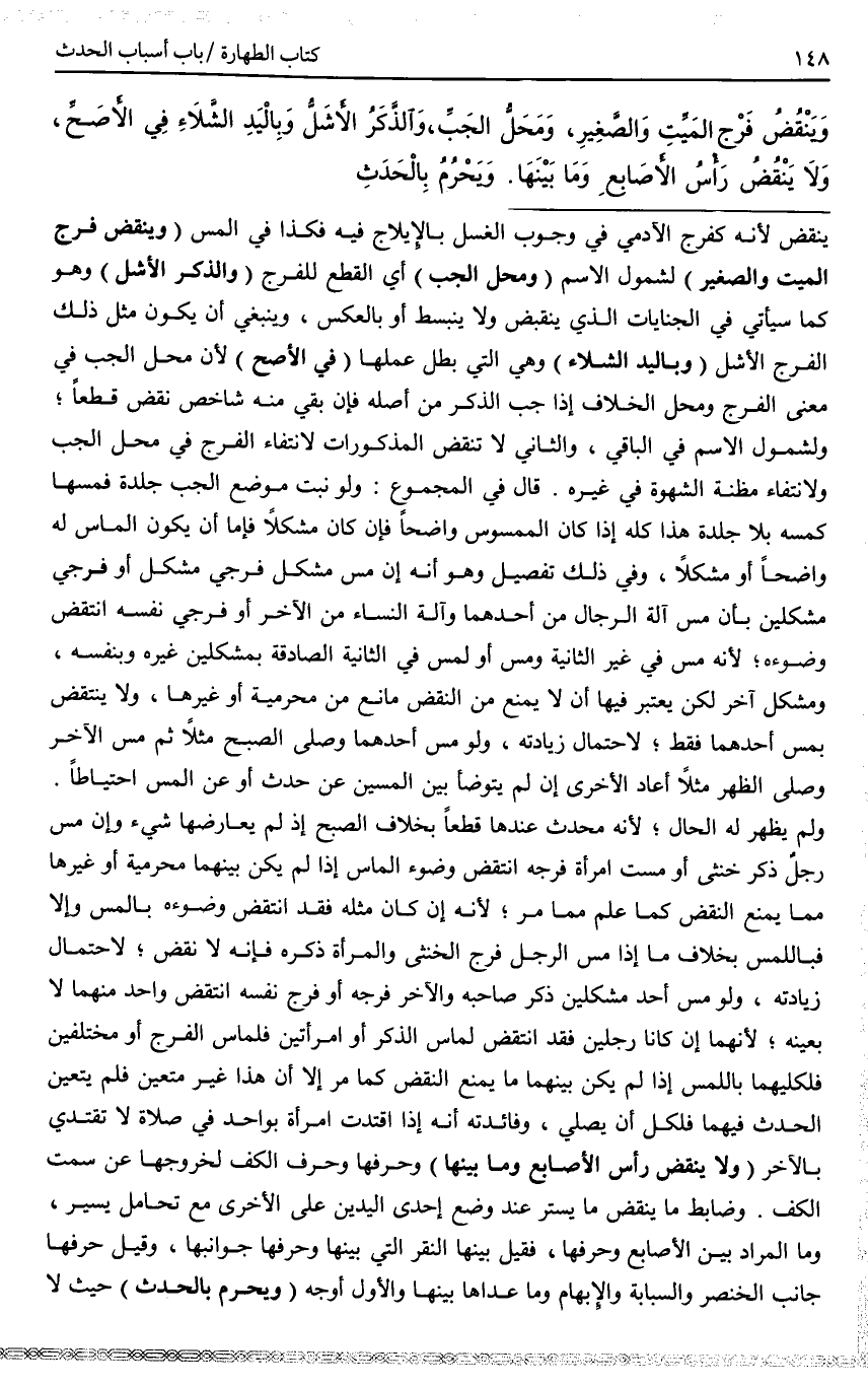 وَيَنْقُضُ فَرْجُ الْمَيِّتِ وَالصَّغِيرِ، وَمَحَلُّ الْجَبِّ، وَالذَّكَرُ الْأَشَلُّ وَبِالْيَدِ الشَّلَّاءِ فِي الْأَصَحِّ، وَلَا يَنْقُضُ رَأْسُ الْأَصَابِعِ وَمَا بَيْنَهَا.