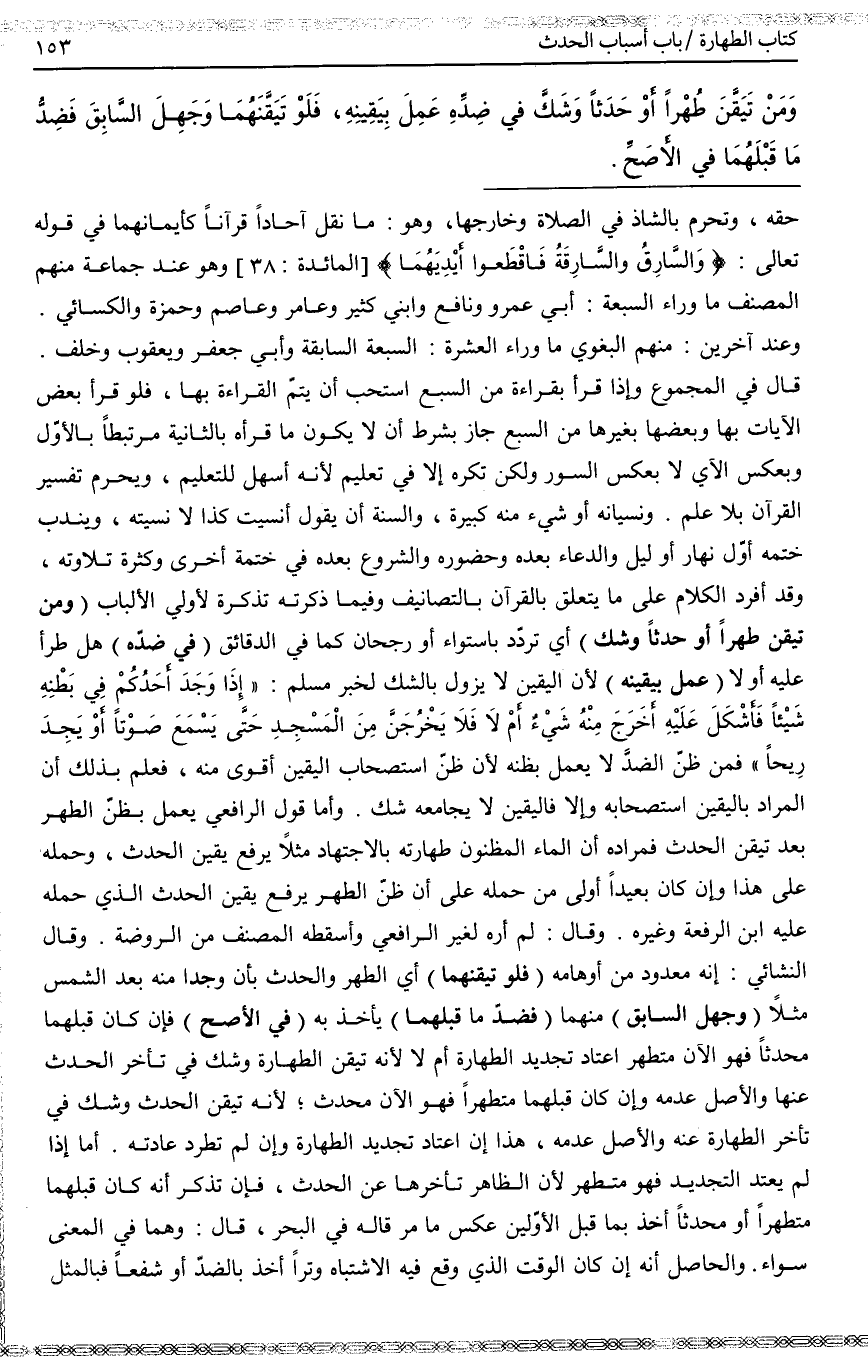ـــــــــــــــــــــــــــــQحَقِّهِ، وَتَحْرُمُ بِالشَّاذِّ فِي الصَّلَاةِ وَخَارِجِهَا، وَهُوَ: مَا نُقِلَ آحَادًا قُرْآنًا كَ " أَيْمَانَهُمَا " فِي قَوْله تَعَالَى: {وَالسَّارِقُ وَالسَّارِقَةُ فَاقْطَعُوا أَيْدِيَهُمَا} [المائدة: 38] [الْمَائِدَةُ] وَهُوَ عِنْدَ جَمَاعَةٍ مِنْهُمْ الْمُصَنِّفُ مَا وَرَاءَ السَّبْعَةِ: أَبِي عَمْرٍو وَنَافِعٍ وَابْنَيْ كَثِيرٍ وَعَامِرٍ وَعَاصِمٍ وَحَمْزَةَ وَالْكِسَائِيِّ. وَعِنْدَ آخَرِينَ: مِنْهُمْ الْبَغَوِيّ مَا وَرَاءَ الْعَشَرَةِ: السَّبْعَةِ السَّابِقَةِ وَأَبِي جَعْفَرٍ وَيَعْقُوبَ وَخَلَفٍ. قَالَ فِي الْمَجْمُوعِ وَإِذَا قَرَأَ بِقِرَاءَةٍ مِنْ السَّبْعِ اُسْتُحِبَّ أَنْ يُتِمَّ الْقِرَاءَةَ بِهَا، فَلَوْ قَرَأَ بَعْضَ الْآيَاتِ بِهَا وَبَعْضَهَا بِغَيْرِهَا مِنْ السَّبْعِ جَازَ بِشَرْطِ أَنْ لَا يَكُونَ مَا قَرَأَهُ بِالثَّانِيَةِ مُرْتَبِطًا بِالْأَوَّلِ وَبِعَكْسِ الْآيِ لَا بِعَكْسِ السُّوَرِ وَلَكِنْ تُكْرَهُ إلَّا فِي تَعْلِيمٍ؛ لِأَنَّهُ أَسْهَلُ لِلتَّعْلِيمِ، وَيَحْرُمُ تَفْسِيرُ الْقُرْآنِ بِلَا عِلْمٍ. وَنِسْيَانُهُ أَوْ شَيْءٍ مِنْهُ كَبِيرَةٌ، وَالسُّنَّةُ أَنْ يَقُولَ: أُنْسِيتُ كَذَا لَا نَسِيتُهُ، وَيُنْدَبُ خَتْمُهُ أَوَّلَ نَهَارٍ أَوْ لَيْلٍ وَالدُّعَاءُ بَعْدَهُ وَحُضُورُهُ وَالشُّرُوعُ بَعْدَهُ فِي خَتْمَةٍ أُخْرَى، وَكَثْرَةُ تِلَاوَتِهِ، وَقَدْ أُفْرِدَ الْكَلَامُ عَلَى مَا يَتَعَلَّقُ بِالْقُرْآنِ بِالتَّصَانِيفِ وَفِيمَا ذَكَرْتُهُ تَذْكِرَةٌ لِأُولِي الْأَلْبَابِ (وَمَنْ تَيَقَّنَ طُهْرًا أَوْ حَدَثًا وَشَكَّ) أَيْ تَرَدَّدَ بِاسْتِوَاءٍ أَوْ رُجْحَانٍ كَمَا فِي الدَّقَائِقِ (فِي ضِدِّهِ) هَلْ طَرَأَ عَلَيْهِ أَوْ لَا (عَمِلَ بِيَقِينِهِ) ؛ لِأَنَّ الْيَقِينَ لَا يَزُولُ بِالشَّكِّ لِخَبَرِ مُسْلِمٍ: «إذَا وَجَدَ أَحَدُكُمْ فِي بَطْنِهِ شَيْئًا فَأَشْكَلَ عَلَيْهِ أَخَرَجَ مِنْهُ شَيْءٌ أَمْ لَا فَلَا يَخْرُجَنَّ مِنْ الْمَسْجِدِ حَتَّى يَسْمَعَ صَوْتًا أَوْ يَجِدَ رِيحًا» فَمَنْ ظَنَّ الضِّدَّ لَا يَعْمَلُ بِظَنِّهِ؛ لِأَنَّ ظَنَّ اسْتِصْحَابِ الْيَقِينِ أَقْوَى مِنْهُ، فَعُلِمَ بِذَلِكَ أَنَّ الْمُرَادَ بِالْيَقِينِ اسْتِصْحَابُهُ وَإِلَّا فَالْيَقِينُ لَا يُجَامِعُهُ شَكٌّ. وَأَمَّا قَوْلُ الرَّافِعِيِّ يُعْمَلُ بِظَنِّ الطُّهْرِ بَعْدَ تَيَقُّنِ الْحَدَثِ فَمُرَادُهُ أَنَّ الْمَاءَ الْمَظْنُونَ طَهَارَتُهُ بِالِاجْتِهَادِ مَثَلًا يَرْفَعُ يَقِينَ الْحَدَثِ، وَحَمْلُهُ عَلَى هَذَا، وَإِنْ كَانَ بَعِيدًا أَوْلَى مِنْ حَمْلِهِ عَلَى أَنَّ ظَنَّ الطُّهْرِ يَرْفَعُ يَقِينَ الْحَدَثِ الَّذِي حَمَلَهُ عَلَيْهِ ابْنُ الرِّفْعَةِ وَغَيْرُهُ. وَقَالَ: لَمْ أَرَهُ لِغَيْرِ الرَّافِعِيِّ وَأَسْقَطَهُ الْمُصَنِّفُ مِنْ الرَّوْضَةِ. وَقَالَ النَّشَائِيُّ: إنَّهُ مَعْدُودٌ مِنْ أَوْهَامِهِ (فَلَوْ تَيَقَّنَهُمَا) أَيْ الطُّهْرَ وَالْحَدَثَ بِأَنْ وُجِدَا مِنْهُ بَعْدَ الشَّمْسِ مَثَلًا (وَجَهِلَ السَّابِقَ) مِنْهُمَا (فَضِدُّ مَا قَبْلَهُمَا) يَأْخُذُ بِهِ (فِي الْأَصَحِّ) فَإِنْ كَانَ قَبْلَهُمَا مُحْدِثًا فَهُوَ الْآنَ مُتَطَهِّرٌ اعْتَادَ تَجْدِيدَ الطَّهَارَةِ أَمْ لَا؛ لِأَنَّهُ تَيَقَّنَ الطَّهَارَةَ، وَشَكَّ فِي تَأَخُّرِ الْحَدَثِ عَنْهَا، وَالْأَصْلُ عَدَمُهُ، وَإِنْ كَانَ قَبْلَهُمَا مُتَطَهِّرًا فَهُوَ الْآنَ مُحْدِثٌ؛ لِأَنَّهُ تَيَقَّنَ الْحَدَثَ، وَشَكَّ فِي تَأَخُّرِ الطَّهَارَةِ عَنْهُ، وَالْأَصْلُ عَدَمُهُ، هَذَا إنْ اعْتَادَ تَجْدِيدَ الطَّهَارَةِ، وَإِنْ لَمْ تَطَّرِدْ عَادَتُهُ. أَمَّا إذَا لَمْ يَعْتَدْ التَّجْدِيدَ فَهُوَ مُتَطَهِّرٌ؛ لِأَنَّ الظَّاهِرَ تَأ