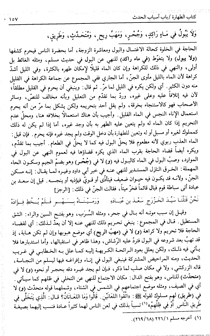 أُجِيبَ بِمَا تَقَدَّمَ، وَيُكْرَهُ أَيْضًا قَضَاءُ الْحَاجَةِ بِقُرْبِ الْمَاءِ الَّذِي يُكْرَهُ قَضَاؤُهَا فِيهِ لِعُمُومِ النَّهْيِ عَنْ الْبَوْلِ فِي الْمَوَارِدِ، وَصَبُّ الْبَوْلِ فِي الْمَاءِ كَالْبَوْلِ فِيهِ (وَ) لَا فِي (جُحْرٍ) . وَهُوَ بِضَمِّ الْجِيمِ وَسُكُونِ الْحَاءِ الْمُهْمَلَةِ: الْخَرْقُ النَّازِلُ الْمُسْتَدِيرُ لِلنَّهْيِ عَنْهُ فِي خَبَرِ أَبِي دَاوُد وَغَيْرِهِ لِمَا يُقَالُ: إنَّهُ مَسْكَنُ الْجِنِّ، وَلِأَنَّهُ قَدْ يَكُونُ فِيهِ حَيَوَانٌ ضَعِيفٌ فَيَتَأَذَّى أَوْ قَوِيٌّ فَيُؤْذِيهِ أَوْ يُنَجِّسُهُ. قِيلَ: إنَّ سَعْدَ بْنَ عُبَادَةَ أَتَى سُبَاطَةَ قَوْمٍ فَبَالَ قَائِمًا فَخَرَّ مَيِّتًا، فَقَالَتْ الْجِنُّ فِي ذَلِكَ: {الرَّجَزُ} نَحْنُ قَتَلْنَا سَيِّدَ الْخَزْرَجِ سَعْدَ بْنَ عُبَادَةَ وَرَمَيْنَاهُ بِسَهْمٍ فَلَمْ يُخْطِ فُؤَادَهْ. وَقِيلَ إنْ سَبَبَ مَوْتِهِ أَنَّهُ بَالَ فِي جُحْرٍ