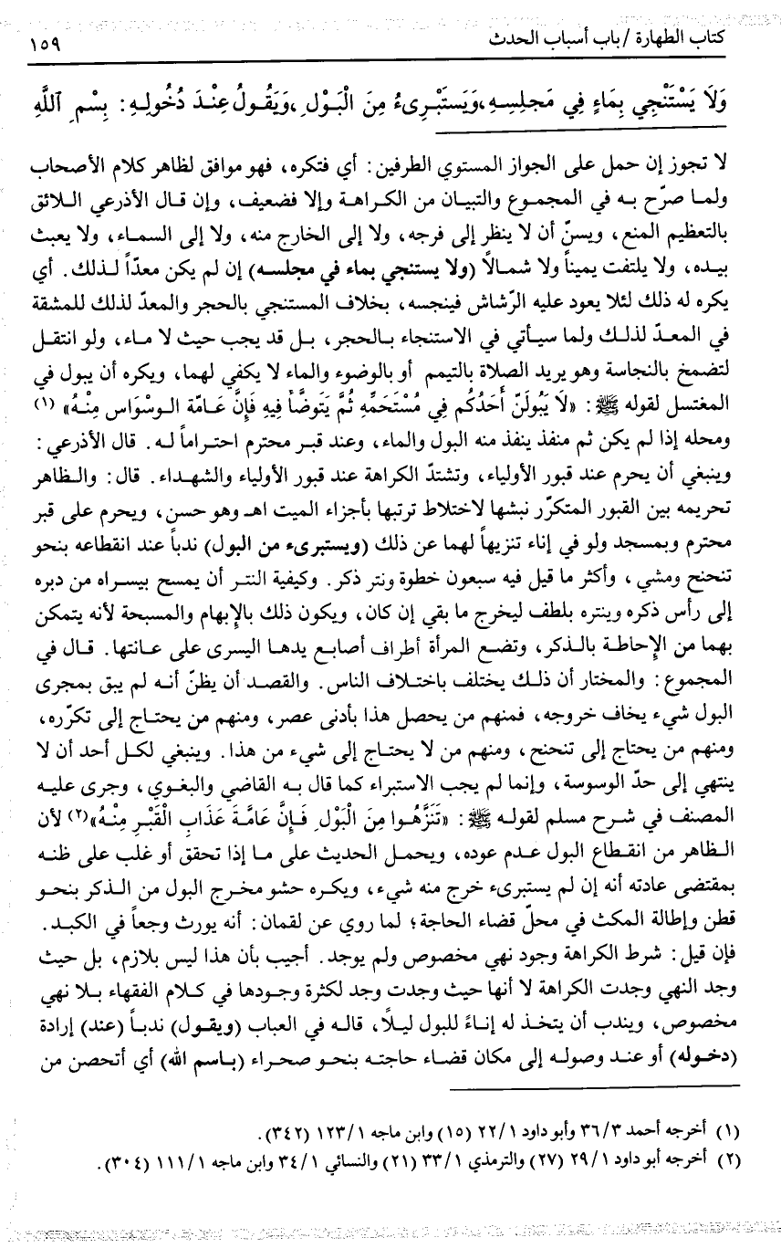 وَلَا يَسْتَنْجِي بِمَاءٍ فِي مَجْلِسِهِ، وَيَسْتَبْرِئُ مِنْ الْبَوْلِ، وَيَقُولُ عِنْدَ دُخُولِهِ: بِسْمِ اللَّهِ