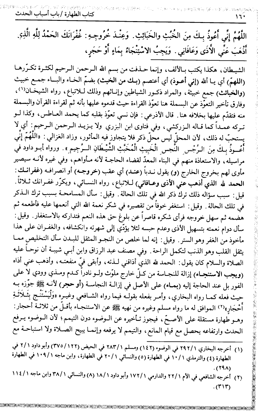 ـــــــــــــــــــــــــــــQالشَّيْطَانِ، هَكَذَا يُكْتَبُ بِالْأَلِفِ، وَإِنَّمَا حُذِفَتْ مِنْ بِسْمِ اللَّهِ الرَّحْمَنِ الرَّحِيمِ لِكَثْرَةِ تَكَرُّرِهَا (اللَّهُمَّ) أَيْ يَا أَللَّهُ (إنْي أَعُوذُ) أَيْ أَعْتَصِمُ (بِكَ مِنْ الْخُبُثِ) بِضَمِّ الْخَاءِ وَالْبَاءِ جَمْعُ خَبِيثٍ (وَالْخَبَائِثِ) جَمْعُ خَبِيثَةٍ، وَالْمُرَادُ ذُكُورُ الشَّيَاطِينِ وَإِنَاثُهُمْ وَذَلِكَ لِلِاتِّبَاعِ، رَوَاهُ الشَّيْخَانِ (1) ، وَفَارَقَ تَأْخِيرُ التَّعَوُّذِ عَنْ الْبَسْمَلَةِ هُنَا تَعُوذَ الْقِرَاءَةِ حَيْثُ قَدَّمُوهُ عَلَيْهَا بِأَنَّهُ ثَمَّ لِقِرَاءَةِ الْقُرْآنِ وَالْبَسْمَلَةُ مِنْهُ فَتُقَدَّمُ عَلَيْهَا بِخِلَافِهِ هُنَا.