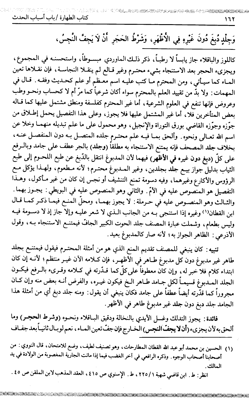 ـــــــــــــــــــــــــــــQكَاللَّوْزِ وَالْبَاقِلَاءِ جَازَ يَابِسًا لَا رَطْبًا، ذَكَرَ ذَلِكَ الْمَاوَرْدِيُّ مَبْسُوطًا، وَاسْتَحْسَنَهُ فِي الْمَجْمُوعِ، وَيُجْزِئُ الْحَجَرُ بَعْدَ الِاسْتِنْجَاءِ بِشَيْءٍ مُحْتَرَمٍ وَغَيْرِ قَالِعٍ لَمْ يَنْقُلَا النَّجَاسَةَ، فَإِنْ نَقَلَاهَا تَعَيَّنَ الْمَاءُ كَمَا سَيَأْتِي، وَمِنْ الْمُحْتَرَمِ مَا كُتِبَ عَلَيْهِ اسْمٌ مُعَظَّمٌ أَوْ عِلْمٌ كَحَدِيثٍ وَفِقْهٍ. قَالَ فِي الْمُهِمَّاتِ: وَلَا بُدَّ مِنْ تَقْيِيدِ الْعِلْمِ بِالْمُحْتَرَمِ سَوَاءٌ أَكَانَ شَرْعِيًّا كَمَا مَرَّ أَمْ لَا كَحِسَابٍ وَنَحْوٍ وَطِبٍّ وَعَرُوضٍ فَإِنَّهَا تَنْفَعُ فِي الْعُلُومِ الشَّرْعِيَّةِ، أَمَّا غَيْرُ الْمُحْتَرَمِ كَفَلْسَفَةٍ وَمَنْطِقٍ مُشْتَمِلٍ عَلَيْهِمَا كَمَا قَالَهُ بَعْضُ الْمُتَأَخِّرِينَ فَلَا، أَمَّا غَيْرُ الْمُشْتَمِلِ عَلَيْهَا فَلَا يَجُوزُ، وَعَلَى هَذَا التَّفْصِيلِ يُحْمَلُ، إطْلَاقُ مَنْ جَوَّزَهُ وَجَوَّزَهُ الْقَاضِي بِوَرَقِ التَّوْرَاةِ وَالْإِنْجِيلِ، وَهُوَ مَحْمُولٌ عَلَى مَا عُلِمَ تَبْدِيلُهُ مِنْهُمَا وَخَلَا عَنْ اسْمِ اللَّهِ تَعَالَى وَنَحْوِهِ. وَأُلْحِقَ بِمَا فِيهِ عِلْمٌ مُحْتَرَمٌ جِلْدُهُ الْمُتَّصِلُ بِهِ دُونَ الْمُنْفَصِلِ عَنْهُ، بِخِلَافِ جِلْدِ الْمُصْحَفِ فَإِنَّهُ يَمْتَنِعُ الِاسْتِنْجَاءُ بِهِ مُطْلَقًا (وَجِلْدٍ) بِالْجَرِّ عَطْفٌ عَلَى جَامِدٍ، وَبِالرَّفْعِ عَلَى كُلُّ (دُبِغَ دُونَ غَيْرِهِ فِي الْأَظْهَرِ) فِيهِمَا؛ لِأَنَّ الْمَدْبُوغَ انْتَقَلَ بِالدَّبْغِ عَنْ طَبْعِ اللُّحُومِ إلَى طَبْعِ الثِّيَابِ بِدَلِيلِ جَوَازِ بَيْعِ جِلْدٍ بِجِلْدَيْنِ، وَغَيْرُ الْمَدْبُوغِ مُحْتَرَمٌ؛ لِأَنَّهُ مَطْعُوم، وَلِهَذَا يُؤْكَلُ مَعَ الرُّءُوسِ وَالْأَكَارِعِ وَغَيْرِهِمَا، وَفِيهِ دُسُومَةٌ تَمْنَعُ التَّنْشِيفَ أَوْ نَجَسٌ إنْ كَانَ مِنْ غَيْرِ مَأْكُولٍ، وَهَذَا التَّفْصِيلُ هُوَ الْمَنْصُوصُ عَلَيْهِ فِي الْأُمِّ.