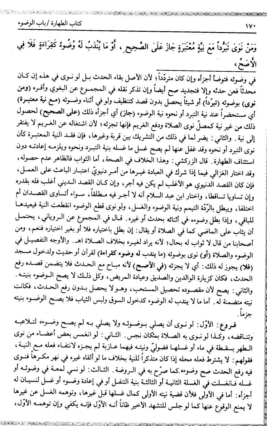 (أَوْ) نَوَى بِوُضُوئِهِ (مَا يُنْدَبُ لَهُ وُضُوءٌ كَقِرَاءَةٍ) لِقُرْآنٍ أَوْ حَدِيثٍ وَلِدُخُولِ مَسْجِدٍ (فَلَا) يَجُوزُ لَهُ ذَلِكَ: أَيْ لَا يُجْزِئُهُ (فِي الْأَصَحِّ) ؛ لِأَنَّهُ مُبَاحٌ مَعَ الْحَدَثِ فَلَا يَتَضَمَّنُ قَصْدُهُ رَفْعَ الْحَدَثِ، فَكَانَ كَزِيَارَةِ الْوَالِدَيْنِ وَالصَّدِيقِ وَعِيَادَةِ الْمَرِيضِ، وَكُلُّ ذَلِكَ لَا يَصِحُّ الْوُضُوءُ بِنِيَّتِهِ. وَالثَّانِي: يَصِحُّ؛ لِأَنَّ مَقْصُودَهُ تَحْصِيلُ الْمُسْتَحَبِّ، وَهُوَ لَا يَحْصُلُ بِدُونِ رَفْعِ الْحَدَثِ، فَكَانَتْ نِيَّتُهُ مُتَضَمِّنَةً لَهُ. أَمَّا مَا لَا يُنْدَبُ لَهُ الْوُضُوءُ كَدُخُولِ السُّوقِ وَلُبْسِ الثِّيَابِ فَلَا يَصِحُّ الْوُضُوءُ بِنِيَّتِهِ جَزْمًا.