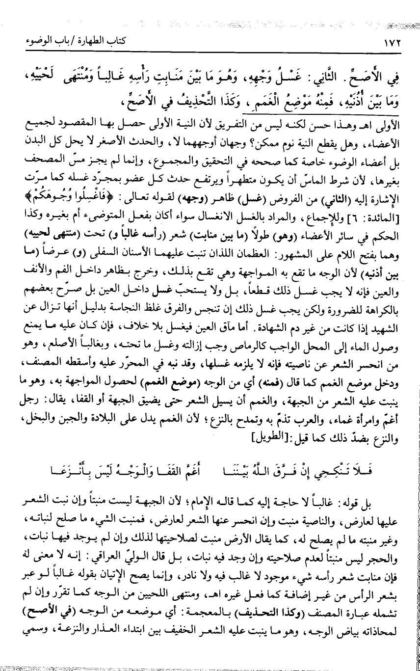 الثَّانِي: غَسْلُ وَجْهِهِ، وَهُوَ مَا بَيْنَ مَنَابِتِ رَأْسِهِ غَالِبًا وَمُنْتَهَى لَحْيَيْهِ، وَمَا بَيْنَ أُذُنَيْهِ، فَمِنْهُ مَوْضِع الْغَمَمِ، وَكَذَا التَّحْذِيفُ فِي الْأَصَحِّ،