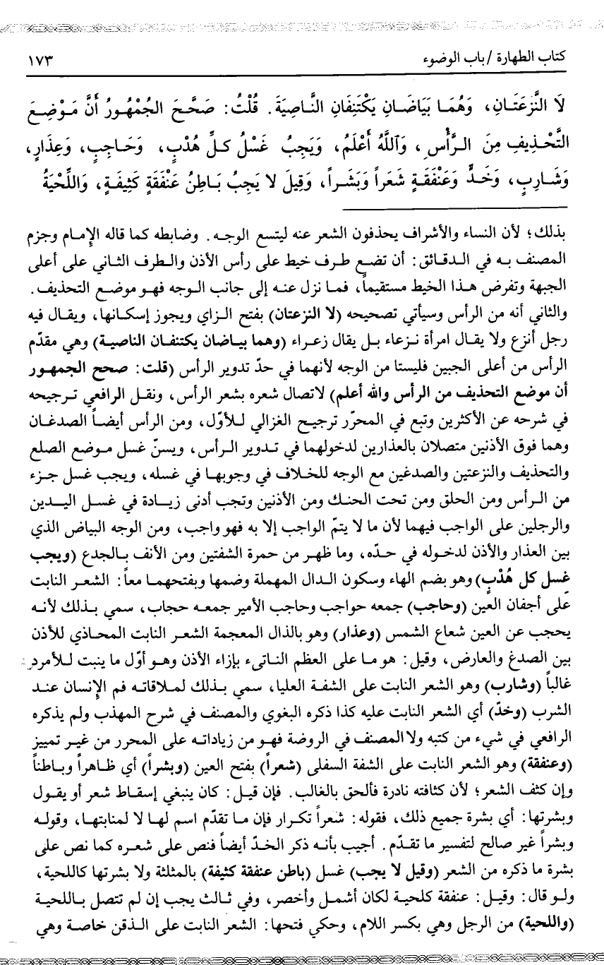 وَالثَّانِي أَنَّهُ مِنْ الرَّأْسِ وَسَيَأْتِي تَصْحِيحُهُ (لَا النَّزْعَتَانِ) بِفَتْحِ الزَّايِ وَيَجُوزُ إسْكَانُهَا، وَيُقَالُ فِيهِ رَجُلٌ أَنْزَعُ وَلَا يُقَالُ امْرَأَةٌ نَزْعَاءُ بَلْ يُقَالُ زَعْرَاءُ (وَهُمَا بَيَاضَانِ يَكْتَنِفَانِ النَّاصِيَةَ) وَهِيَ مُقَدَّمُ الرَّأْسِ مِنْ أَعْلَى الْجَبِينِ فَلَيْسَتَا مِنْ الْوَجْهِ؛ لِأَنَّهُمَا فِي حَدِّ تَدْوِيرِ الرَّأْسِ (قُلْتُ: صَحَّحَ الْجُمْهُورِ أَنَّ مَوْضِعَ التَّحْذِيفِ مِنْ الرَّأْسِ وَاَللَّهُ أَعْلَمُ) لِاتِّصَالِ شَعْرِهِ بِشَعْرِ الرَّأْسِ، وَنَقَلَ الرَّافِعِيُّ تَرْجِيحَهُ فِي شَرْحِهِ عَنْ الْأَكْثَرِينَ وَتَبِعَ فِي الْمُحَرَّرِ تَرْجِيحَ الْغَزَالِيِّ لِلْأَوَّلِ، وَمِنْ الرَّأْسِ أَيْضًا الصُّدْغَانِ وَهُمَا فَوْقَ الْأُذُنَيْنِ مُتَّصِلَانِ بِالْعِذَارَيْنِ لِدُخُولِهِمَا فِي تَدْوِيرِ الرَّأْسِ.
