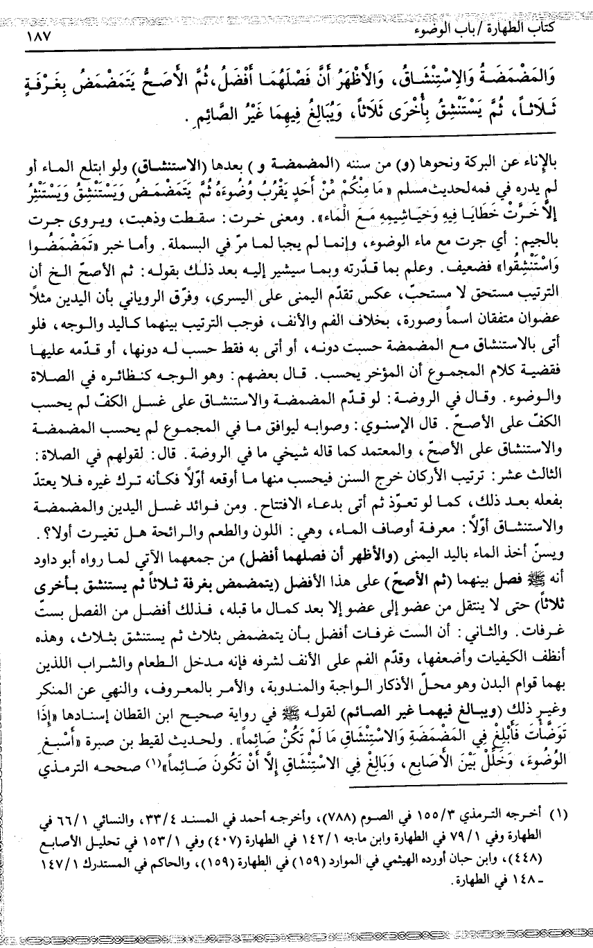 وَالْمَضْمَضَةُ وَالِاسْتِنْشَاقُ، وَالْأَظْهَرُ أَنَّ فَصْلَهُمَا أَفْضَلُ، ثُمَّ الْأَصَحُّ يَتَمَضْمَضُ بِغَرْفَةٍ ثَلَاثًا، ثُمَّ يَسْتَنْشِقُ بِأُخْرَى ثَلَاثًا، وَيُبَالِغُ فِيهِمَا غَيْرُ الصَّائِمِ.