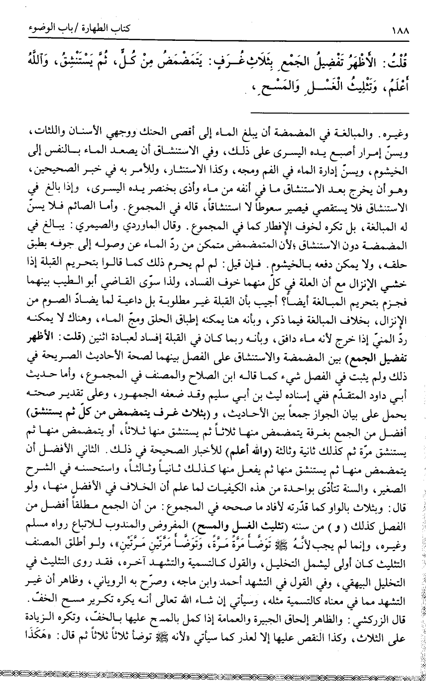 قُلْتُ: الْأَظْهَرُ تَفْضِيلُ الْجَمْعِ بِثَلَاثِ غُرَفٍ يَتَمَضْمَضُ مِنْ كُلٍّ، ثُمَّ يَسْتَنْشِقُ، وَاَللَّهُ أَعْلَمُ.