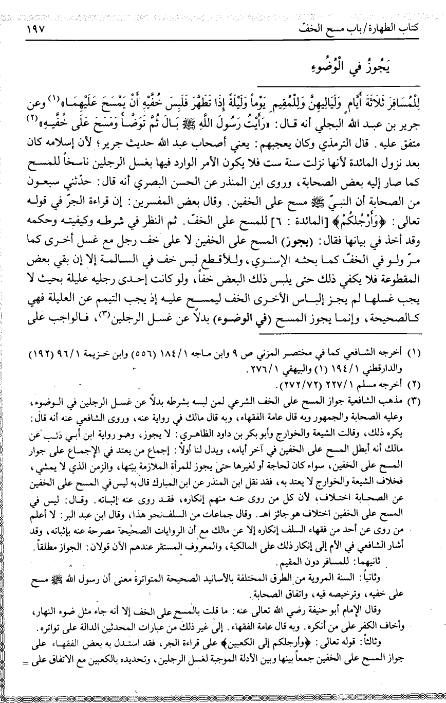 وَقَالَ بَعْضُ الْمُفَسِّرِينَ: إنَّ قِرَاءَةَ الْجَرِّ فِي قَوْله تَعَالَى: {وَأَرْجُلَكُمْ} [المائدة: 6] لِلْمَسْحِ عَلَى الْخُفِّ. ثُمَّ النَّظَرُ فِي شَرْطِهِ وَكَيْفِيَّتِهِ وَحُكْمِهِ وَقَدْ أَخَذَ فِي بَيَانِهَا فَقَالَ: (يَجُوزُ) الْمَسْحُ عَلَى الْخُفَّيْنِ لَا عَلَى خُفِّ رِجْلٍ مَعَ غَسْلِ أُخْرَى كَمَا مَرَّ وَلَوْ فِي الْخُفِّ كَمَا بَحَثَهُ الْإِسْنَوِيُّ، وَلِلْأَقْطَعِ لُبْسُ خُفٍّ فِي السَّالِمَةِ إلَّا إنْ بَقِيَ بَعْضُ الْمَقْطُوعَةِ فَلَا يَكْفِي ذَلِكَ حَتَّى يُلْبِسَ ذَلِكَ الْبَعْضَ خُفًّا، وَلَوْ كَانَتْ إحْدَى رِجْلَيْهِ عَلِيلَةً بِحَيْثُ لَا يَجِبُ غَسْلُهَا لَمْ يَجُزْ إلْبَاسُ الْأُخْرَى الْخُفَّ لِيَمْسَحَ عَلَيْهِ إذْ يَجِبُ التَّيَمُّمُ عَنْ الْعَلِيلَةِ فَهِيَ كَالصَّحِيحَةِ، وَإِنَّمَا يَجُوزُ الْمَسْحُ (فِي الْوُضُوءِ) بَدَلًا عَنْ غَسْلِ الرِّجْلَيْنِ (3) ، فَالْوَاجِبُ عَلَى