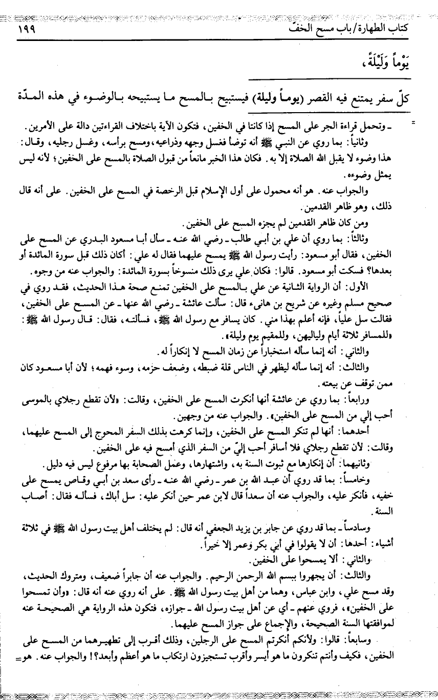 ـــــــــــــــــــــــــــــQكُلُّ سَفَرٍ يَمْتَنِعُ فِيهِ الْقَصْرُ (يَوْمًا وَلَيْلَةً) فَيَسْتَبِيحُ بِالْمَسْحِ مَا يَسْتَبِيحُهُ بِالْوُضُوءِ فِي هَذِهِ الْمُدَّةِ