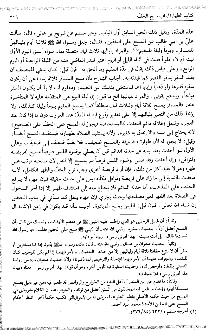 ـــــــــــــــــــــــــــــQهَذِهِ الْمُدَّةِ، وَدَلِيلُ ذَلِكَ الْخَبَرُ السَّابِقُ أَوَّلَ الْبَابِ. وَخَبَرُ مُسْلِمٍ عَنْ شُرَيْحِ بْنِ هَانِئٍ قَالَ: «سَأَلْتُ عَلِيَّ بْنَ أَبِي طَالِبٍ عَنْ الْمَسْحِ عَلَى الْخُفَّيْنِ، فَقَالَ: جَعَلَ رَسُولُ اللَّهِ - صَلَّى اللَّهُ عَلَيْهِ وَسَلَّمَ - ثَلَاثَةَ أَيَّامٍ بِلَيَالِهِنَّ لِلْمُسَافِرِ، وَيَوْمًا وَلَيْلَةً لِلْمُقِيمِ» (1) . وَالْمُرَادُ بِلَيَالِيِهَا ثَلَاثُ لَيَالٍ مُتَّصِلَةٍ بِهَا، سَوَاءٌ أَسَبَقَ الْيَوْمُ الْأَوَّلُ لَيْلَتَهُ أَمْ لَا، فَلَوْ أَحْدَثَ فِي أَثْنَاءِ اللَّيْلِ أَوْ الْيَوْمِ اُعْتُبِرَ قَدْرُ الْمَاضِي مِنْهُ مِنْ اللَّيْلَةِ الرَّابِعَةِ أَوْ الْيَوْمِ الرَّابِعِ، وَعَلَى قِيَاسِ ذَلِكَ يُقَالُ فِي مُدَّةِ الْمُقِيمِ وَمَا أُلْحِقَ بِهِ. فَإِنْ قِيلَ: كَانَ يَنْبَغِي لِلْمُصَنِّفِ أَنْ يُقَيِّدَ السَّفَرَ بِسَفَرِ الْقَصْرِ كَمَا قَيَّدْتُهُ بِهِ.