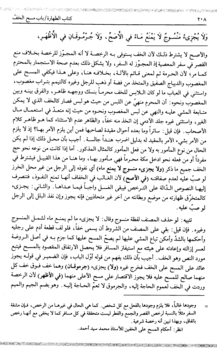 أُجِيبَ بِأَنَّ ذَلِكَ يُفْهَمُ مِنْ قَوْلِهِ أَوَّلَ الْبَابِ، فَإِنَّ الضَّمِيرَ فِي قَوْلِهِ يَجُوزُ عَائِدٌ عَلَى الْمَسْحِ عَلَى الْخُفِّ فَخَرَجَ غَيْرُهُ